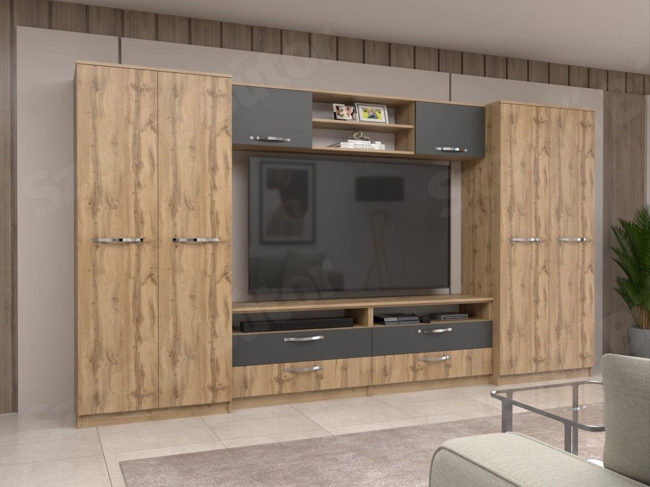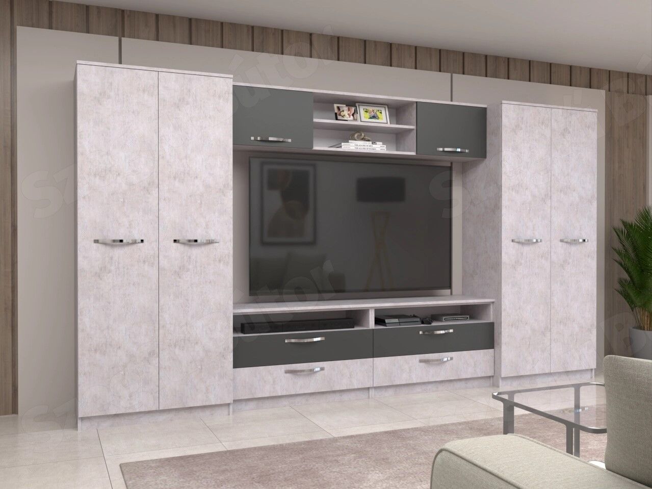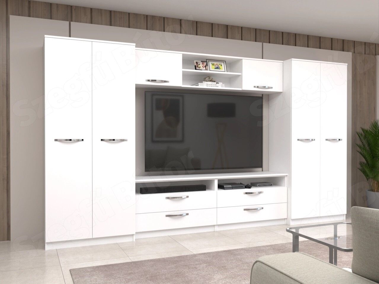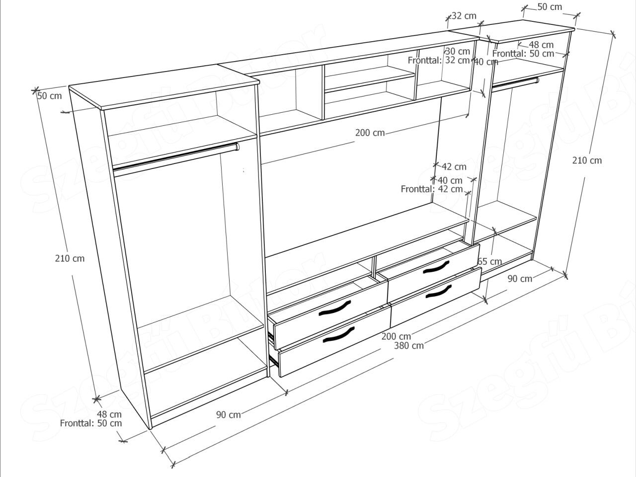 A szekrénysor 18 mm-es laminált bútorlapból ABS élzárással és köldökcsapozással készül. A hátfal a zárt részeken fehér, a nyitott részeken színes /de színben és árnyalatban eltérhet a korpusz színétől/ 2,5 mm-es HDF lemez, mely tűzőkapoccsal van rögzítve. (Az élzárás ABS élfóliával történik, kivéve az íves felületek, melyek technikailag papírfóliával vannak élzárva, melynek színe eltérhet az ABS színétől.)