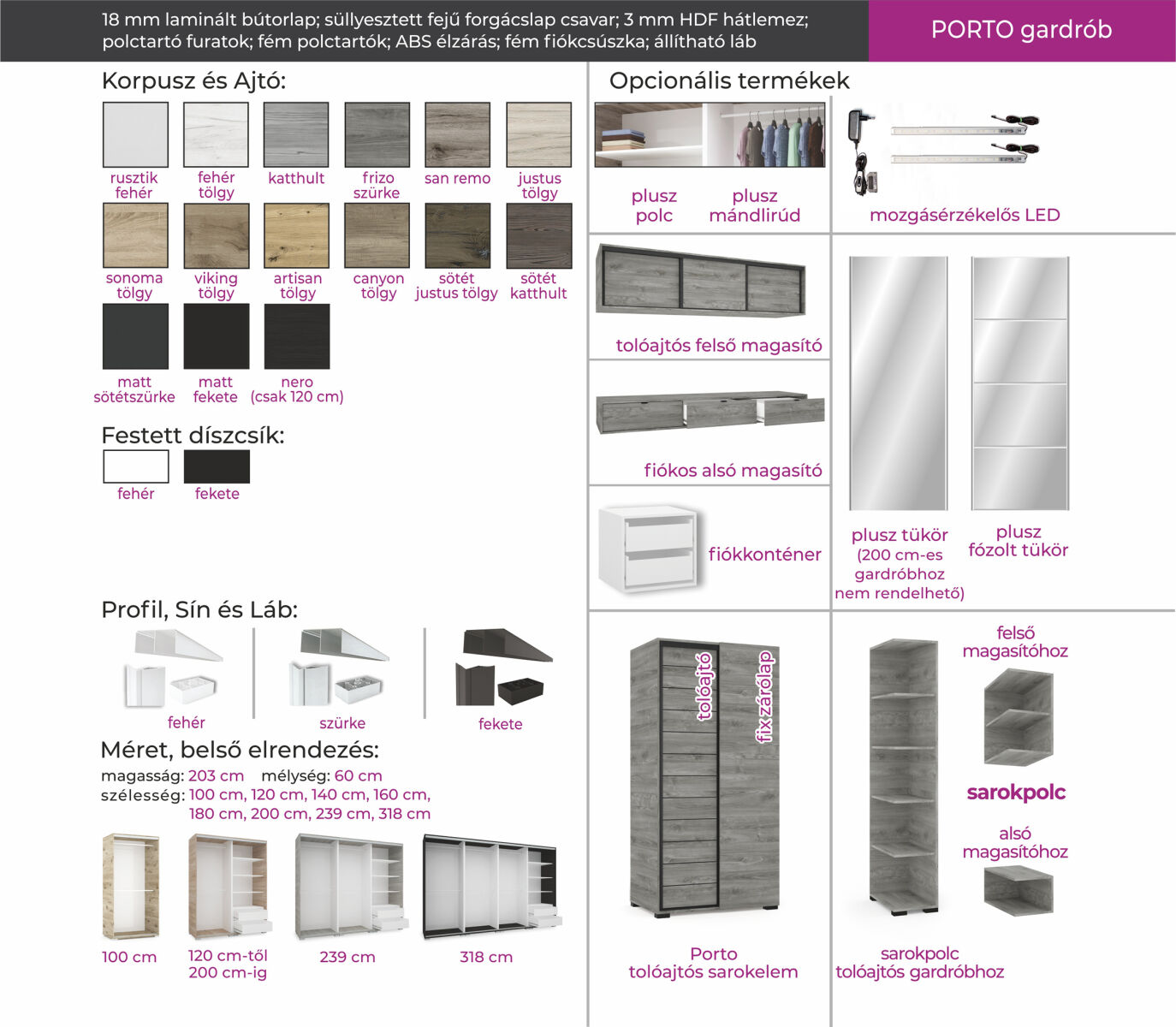 A Porto gardrób 8 féle méretben kapható, és 17 féle bútorlapszín közül lehet választani. A gardrób egyedi, elegáns megjelenését a festett csíkozásnak köszönheti. A vízszintes vonalak harmóniája nyugalmat és eleganciát sugároz. A variálhatóságának köszönhetően bárki a maga ízlésére tudja szabni a gardróbot. Belső elrendezése, a gardróbjainknál már megszokott praktikusságot tükrözi.