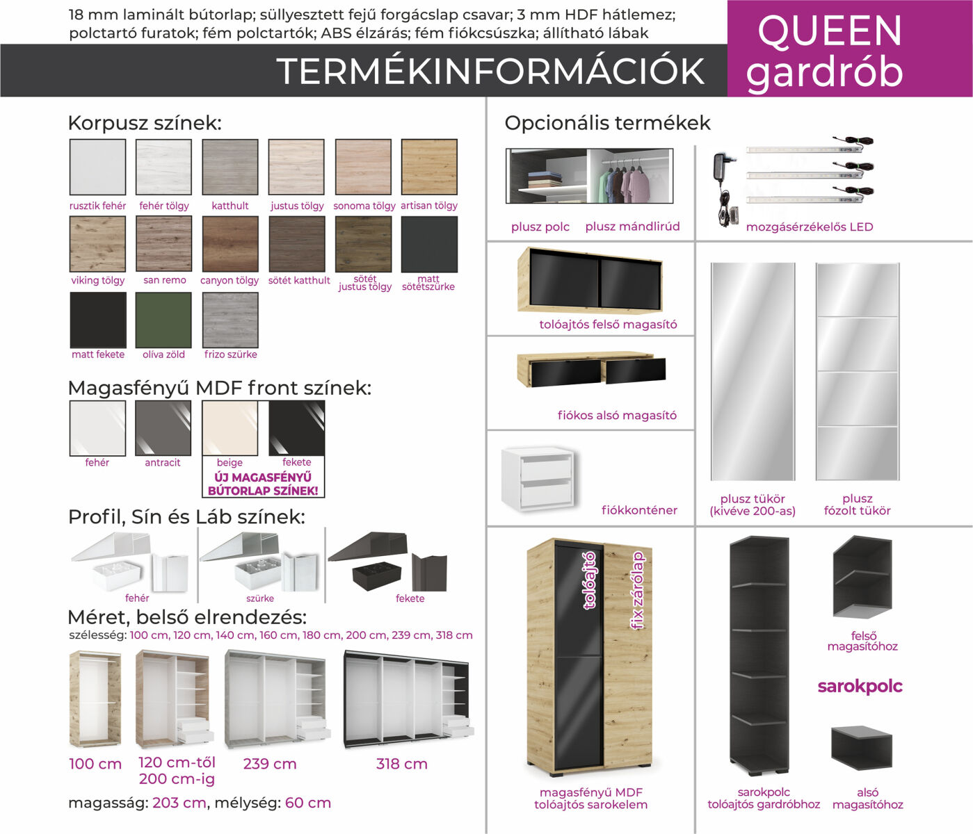 Opcionálisan választható termékek: – sarokpolc – tolóajtós sarokelem – fózolt tükör – tükör – fiókos alsó magasító – tolóajtós felső magasító.