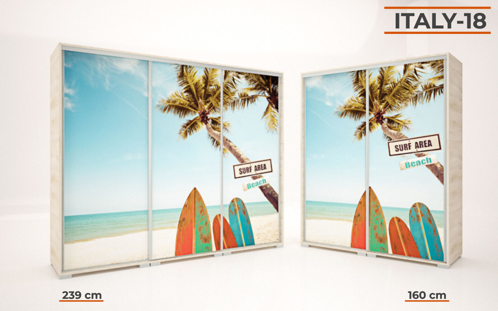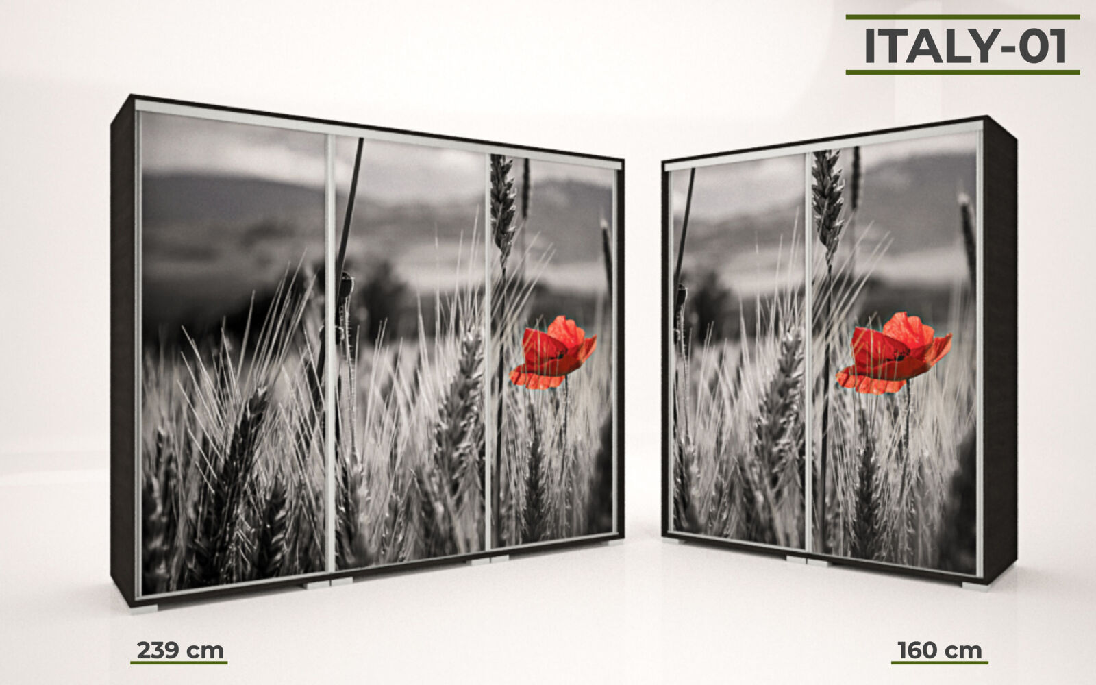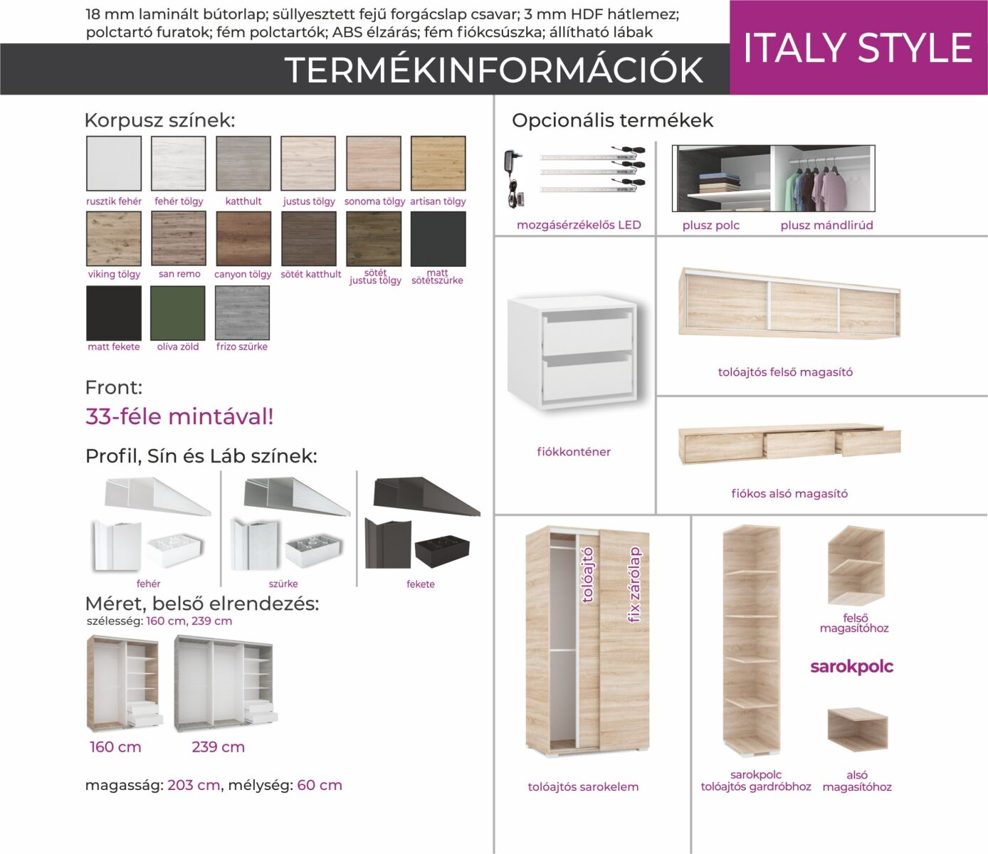 Italy gardrób 160 és 239 cm-es méretben kapható. 16 féle korpusz szín közül választhatunk. A festett mintás ajtó nagyon ízléses megjelenést ad a terméknek. 33 féle minta közül lehet válogatni, szinte minden korosztály talál magának tetsző képet a felhozatal között. Ez a gardrób nem csak hasznos a hálószobában, de egyben annak díszévé is válik. Opcionálisan választható termékek: – sarokpolc – tolóajtós sarokelem – fiókos alsó magasító – tolóajtós felső magasító.