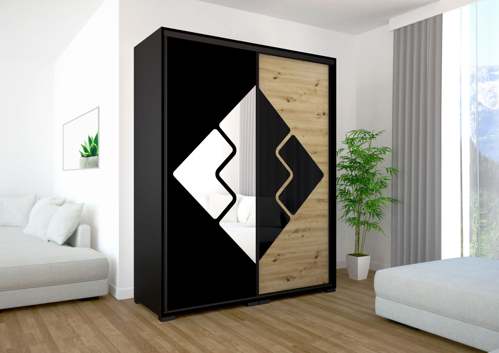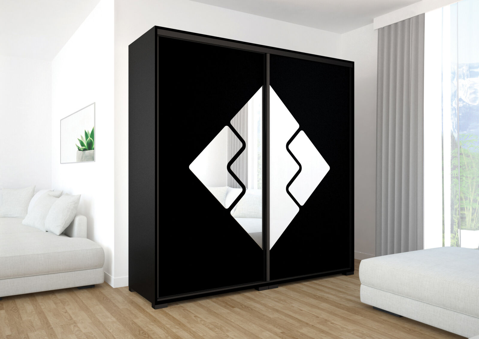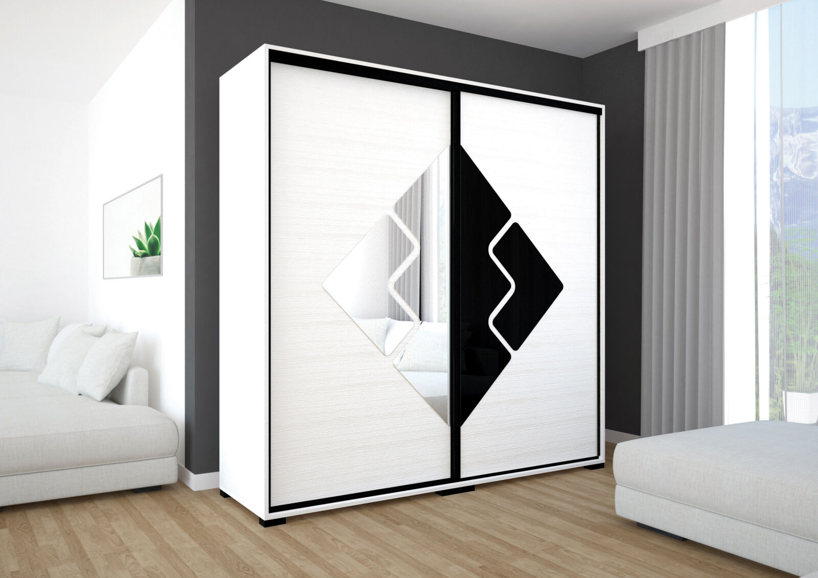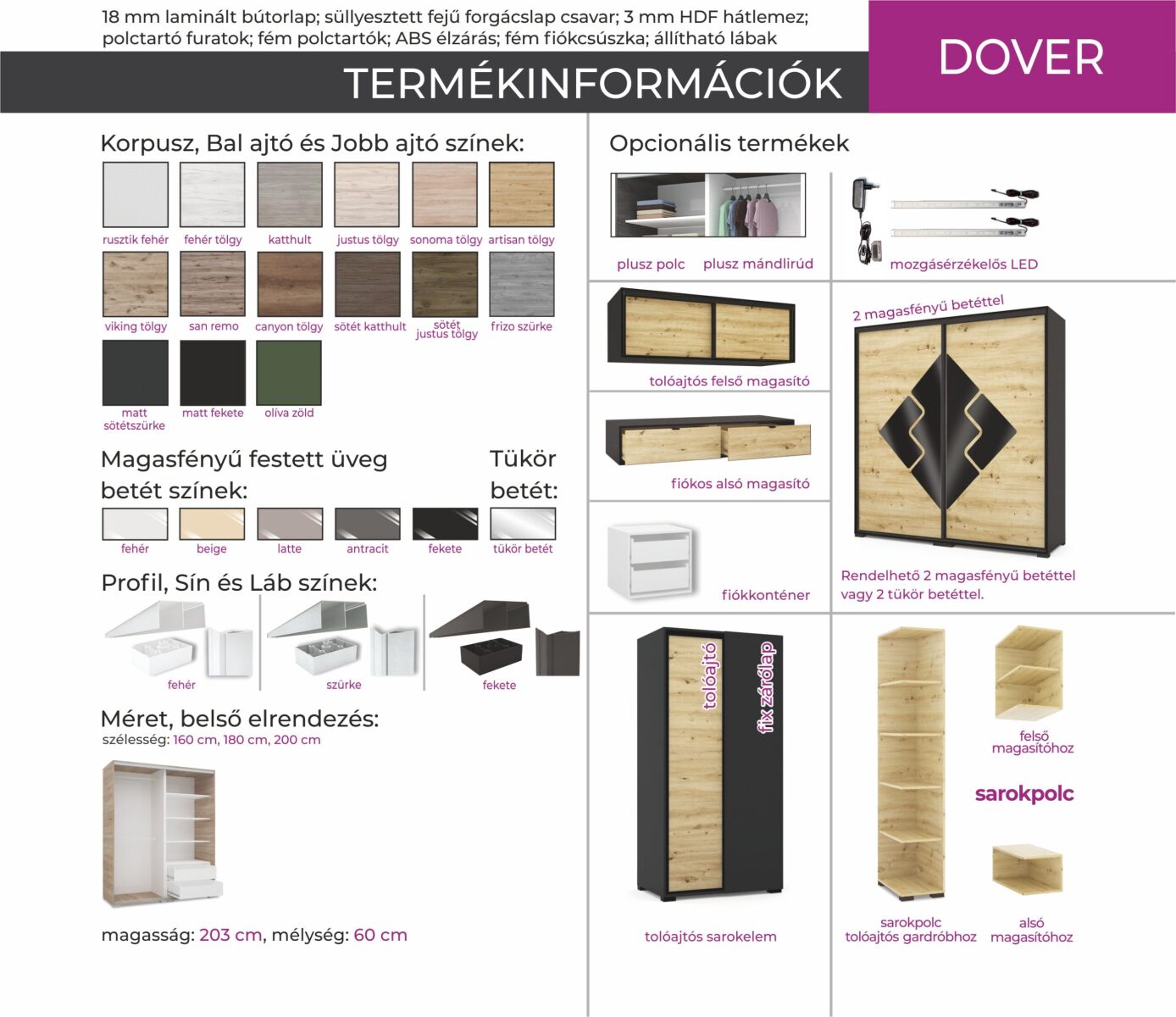 A Dover gardrób egyedi tükör dekorációval azonnal felhívja magára a figyelmet. Elegáns ívek, kellemes bútorlapszínek, ezek mind-mind jellemzik a gardróbot. 160, 180 és 200 cm-es kivitelben kapható, 16 bútorlapszín közül választhatnak kedvükre. A tolóajtónak köszönhetően a tér maximális kihasználását is lehetővé teszi. Belső elrendezése bővíthető polcokkal, fiókkonténerekkel, mándlirudakkal. Az ajtó szín külön választható. Alap variáció: egy tükör betét, illetve egy festett üveg betét, de kérhető kettő tükör betéttel, illetve kettő festett üveg betéttel is.