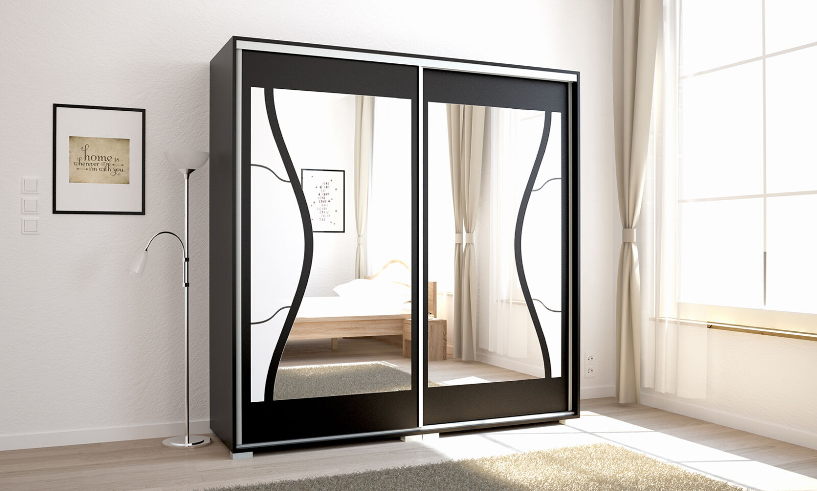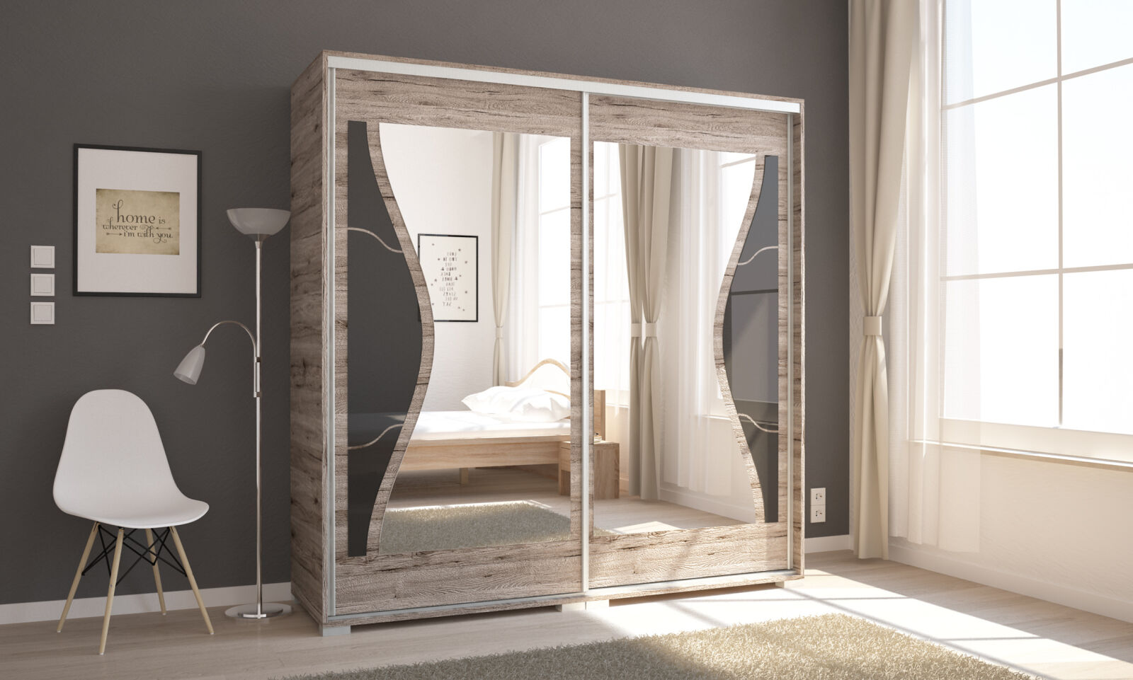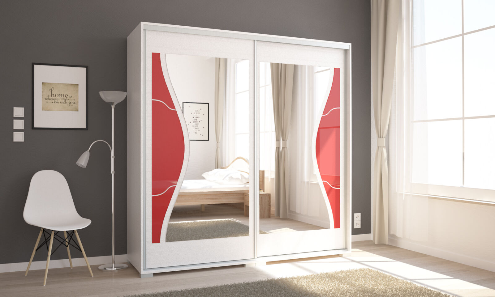 Diego gardrób 200 cm-es szélességgel kapható. 15 bútorlap és 6 festett betét szín közül választhat. Az ívesen vágott üveg elegáns, légies megjelenést kölcsönöz a gardróbnak. Az ajtókon lévő tükör formája is finoman követi az üveg alakját, így alakítva ki egy harmónikus megjelenést. Opcionálisan választható termékek: – sarokpolc – tolóajtós sarokelem – fiókos alsó magasító – tolóajtós felső magasító.