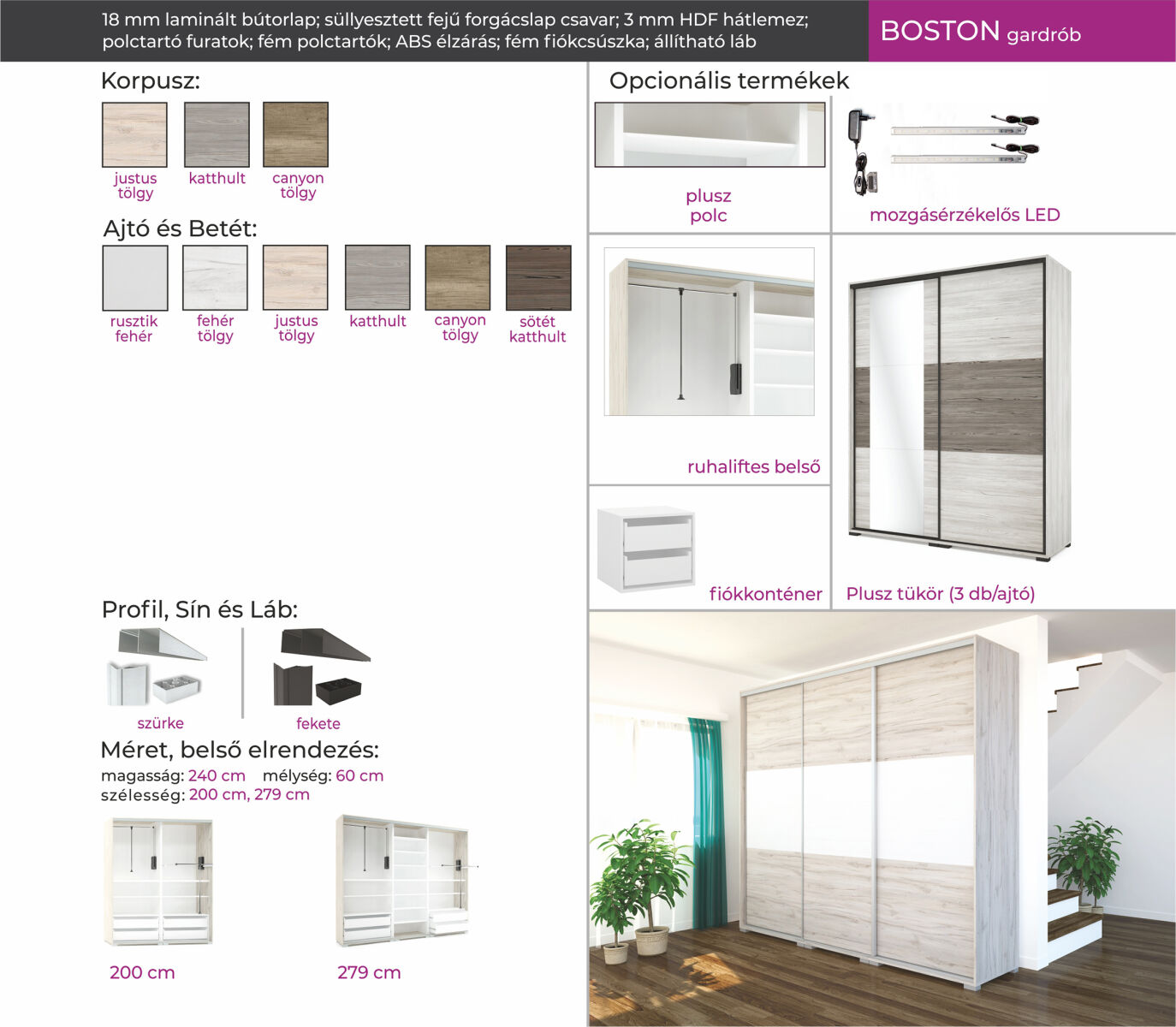 A Boston gardrób 200 és 279 cm-es méretben kapható. Korpusz színei: justus tölgy, katthult, canyon tölgy. Ajtó/betét színek: justus tölgy, katthult, canyon tölgy, rusztik fehér, sötét katthult és fehér tölgy. Az egyik legmagasabb gardróbunk a maga 240 centiméterével. A használhatóság megkönnyítésére ruhalifttel van ellátva.