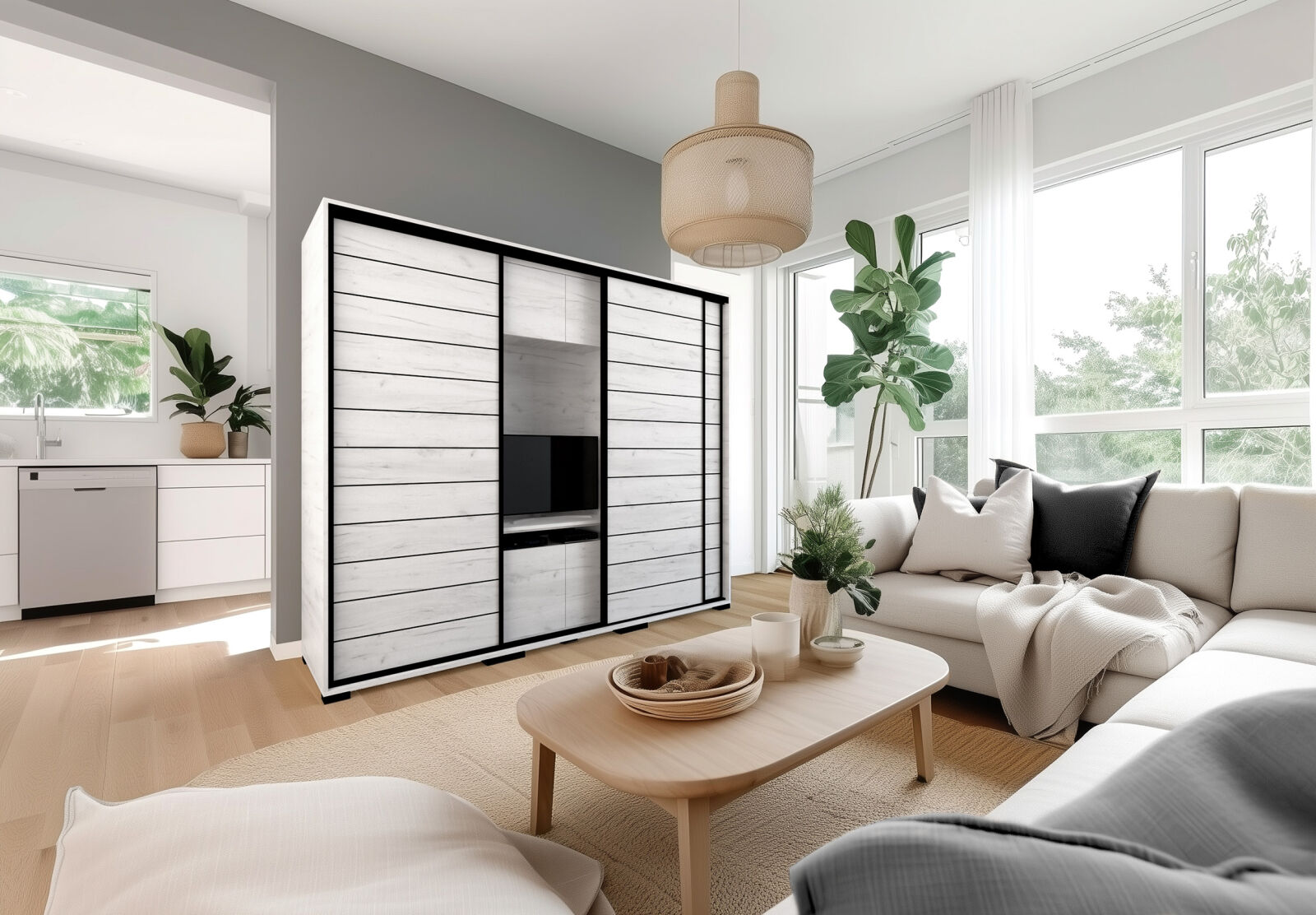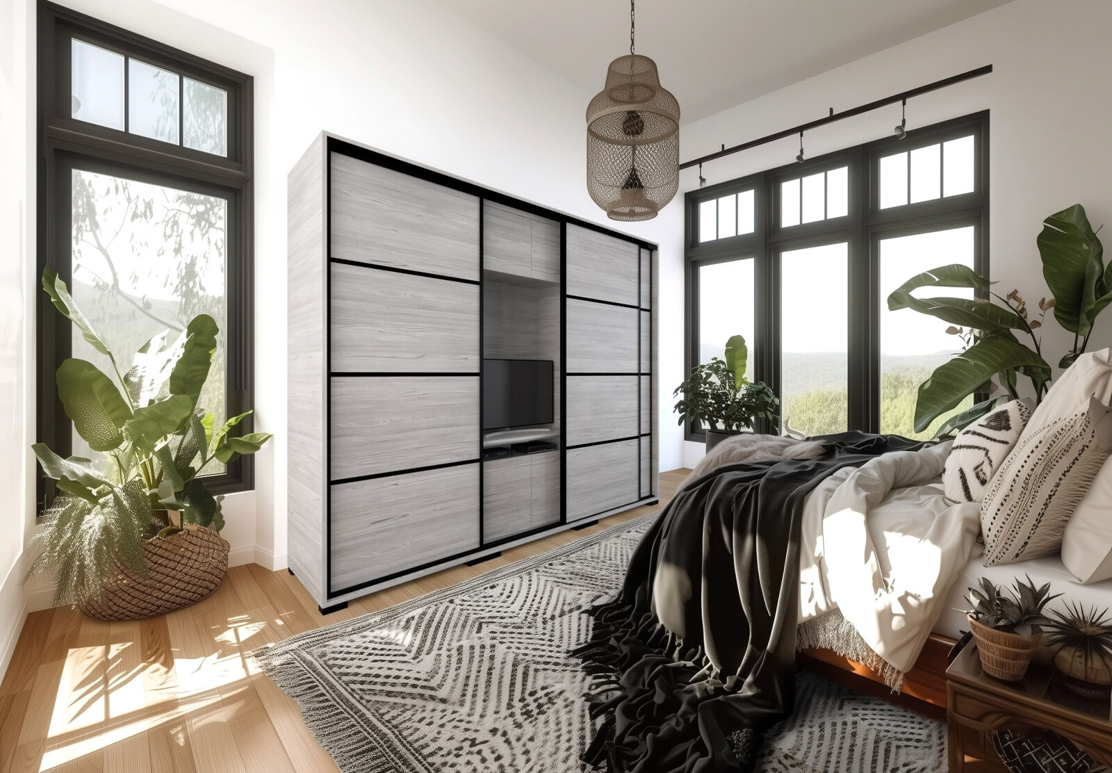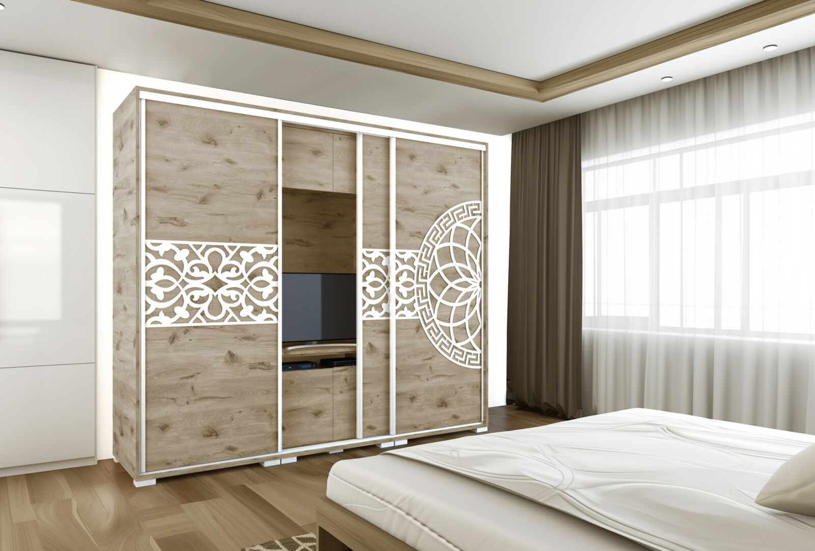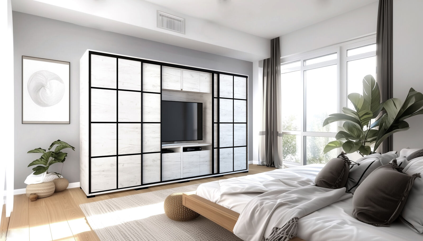 Saját igényére szabhatja a gardrób megjelenését, mivel különböző ajtó típusokkal rendelheti meg. 239 cm és 318 cm-es méretben kaphatóak. Választhatja akár díszcsíkkal ellátott ajtóval, akár tükör vagy üveg dekorációs elemmel, esetleg magasfényű ajtóval is. 14 szín közül lehet választani a korpusz és a front esetében is . Egyediségét az adja, hogy zárt állapotban egy elegáns tolóajtós gardróbnak tűnik, viszont a középső részen televízió számára kialakított hely található. Kiegészíthető még RGB Led világítással. Opcionálisan választható termékek: – sarokpolc – tolóajtós sarokelem – fózolt tükör – tükör – fiókos alsó magasító – tolóajtós felső magasító.