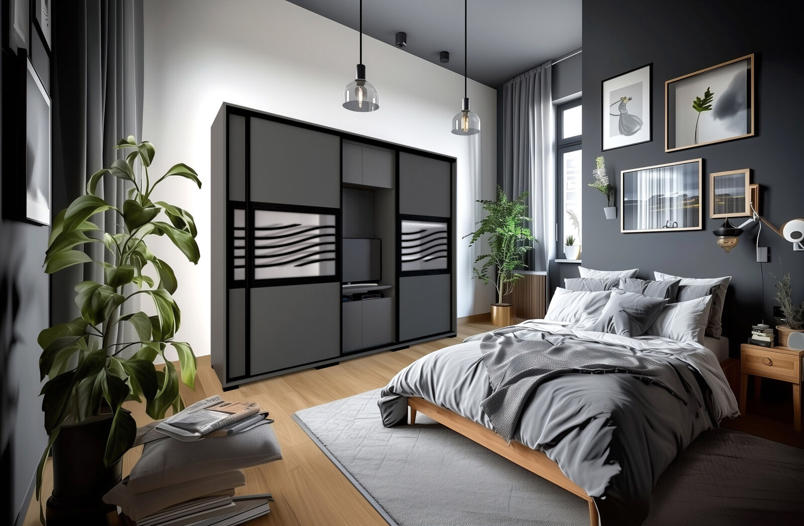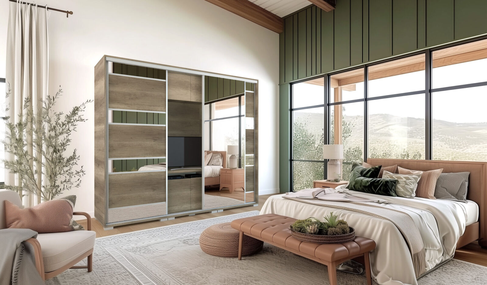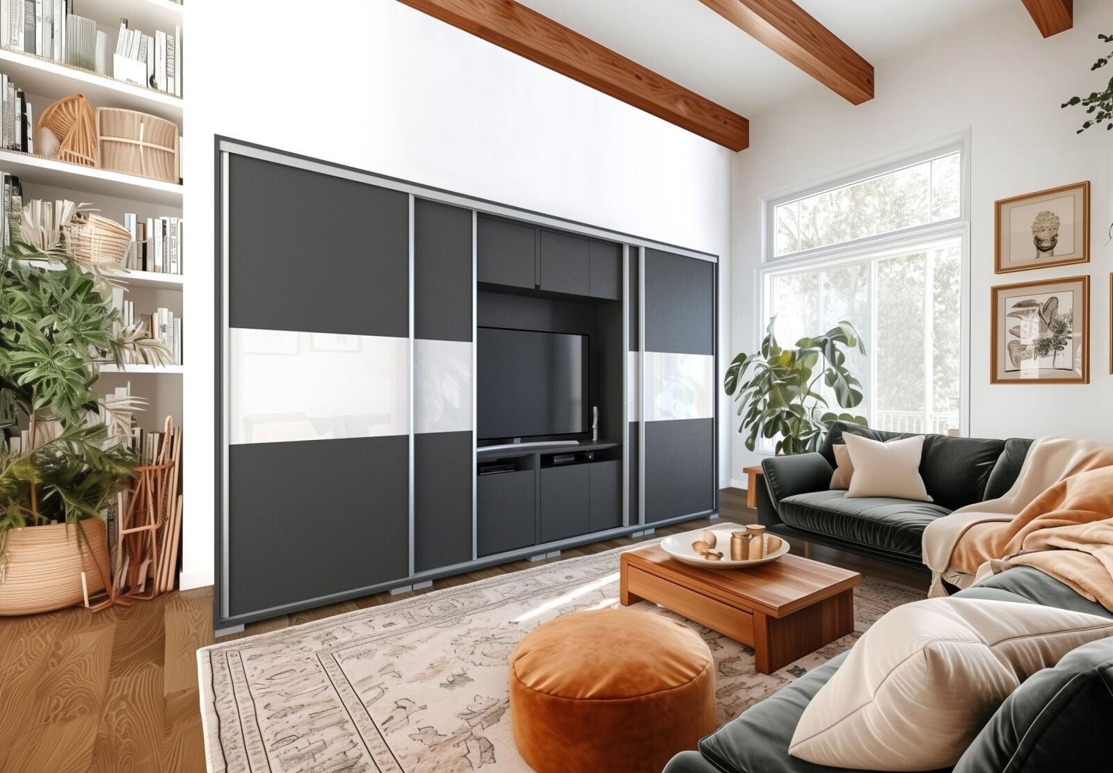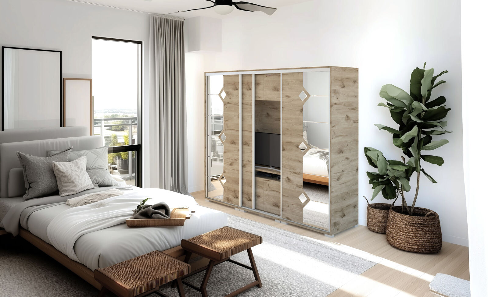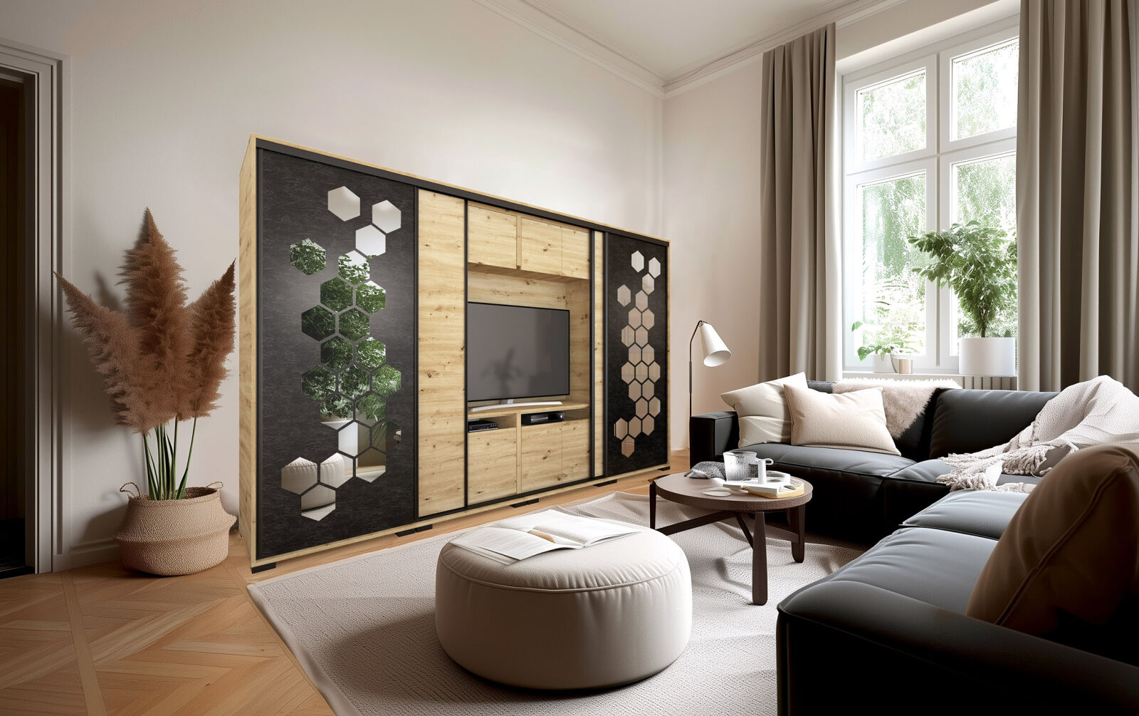 Saját igényére szabhatja a gardrób megjelenését, mivel különböző ajtó típusokkal rendelheti meg. 239 cm és 318 cm-es méretben kaphatóak. Választhatja akár díszcsíkkal ellátott ajtóval, akár tükör vagy üveg dekorációs elemmel, esetleg magasfényű ajtóval is. 14 szín közül lehet választani a korpusz és a front esetében is . Egyediségét az adja, hogy zárt állapotban egy elegáns tolóajtós gardróbnak tűnik, viszont a középső részen televízió számára kialakított hely található. Kiegészíthető még RGB Led világítással. Opcionálisan választható termékek: – sarokpolc – tolóajtós sarokelem – fózolt tükör – tükör – fiókos alsó magasító – tolóajtós felső magasító.