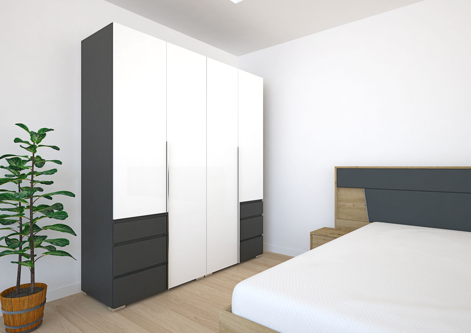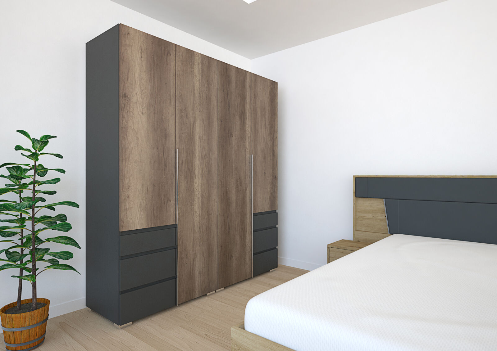 A matt sötétszürke vagy justus tölgy korpuszhoz egyaránt választható canyon tölgy vagy rusztik fehér ajtó. Ezenkívül rendelhető magasfényű fronttal is: fehér vagy szürke ajtóval. Mándlirudas, fiókos elrendezésének köszönhetően nagyon jól pakolható, szükség esetén akár polcokkal is kiegészíthető.
