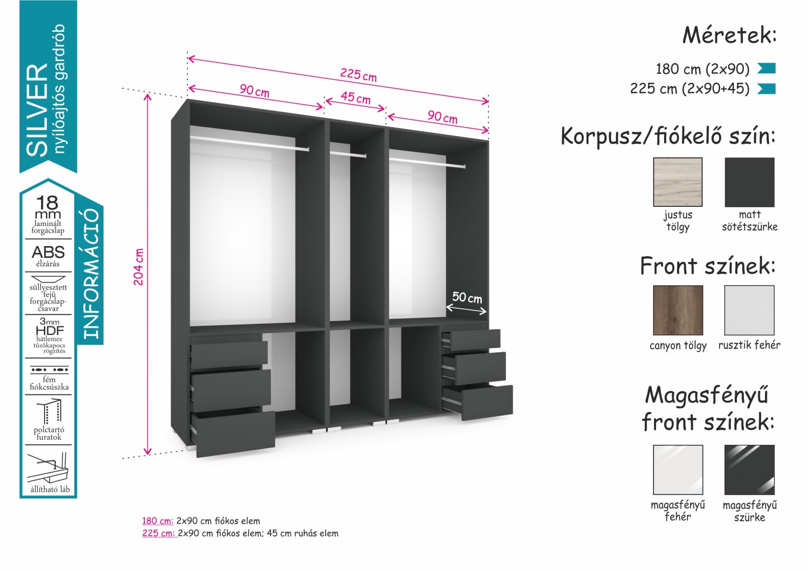 A Silver nyílóajtós gardrób 180 cm-es és 225 cm-es méretben kapható. Tükrös és teleajtós változatban is rendelhető. Elsősorban a modern lakberendezést kedvelők figyelmébe ajánljuk.
