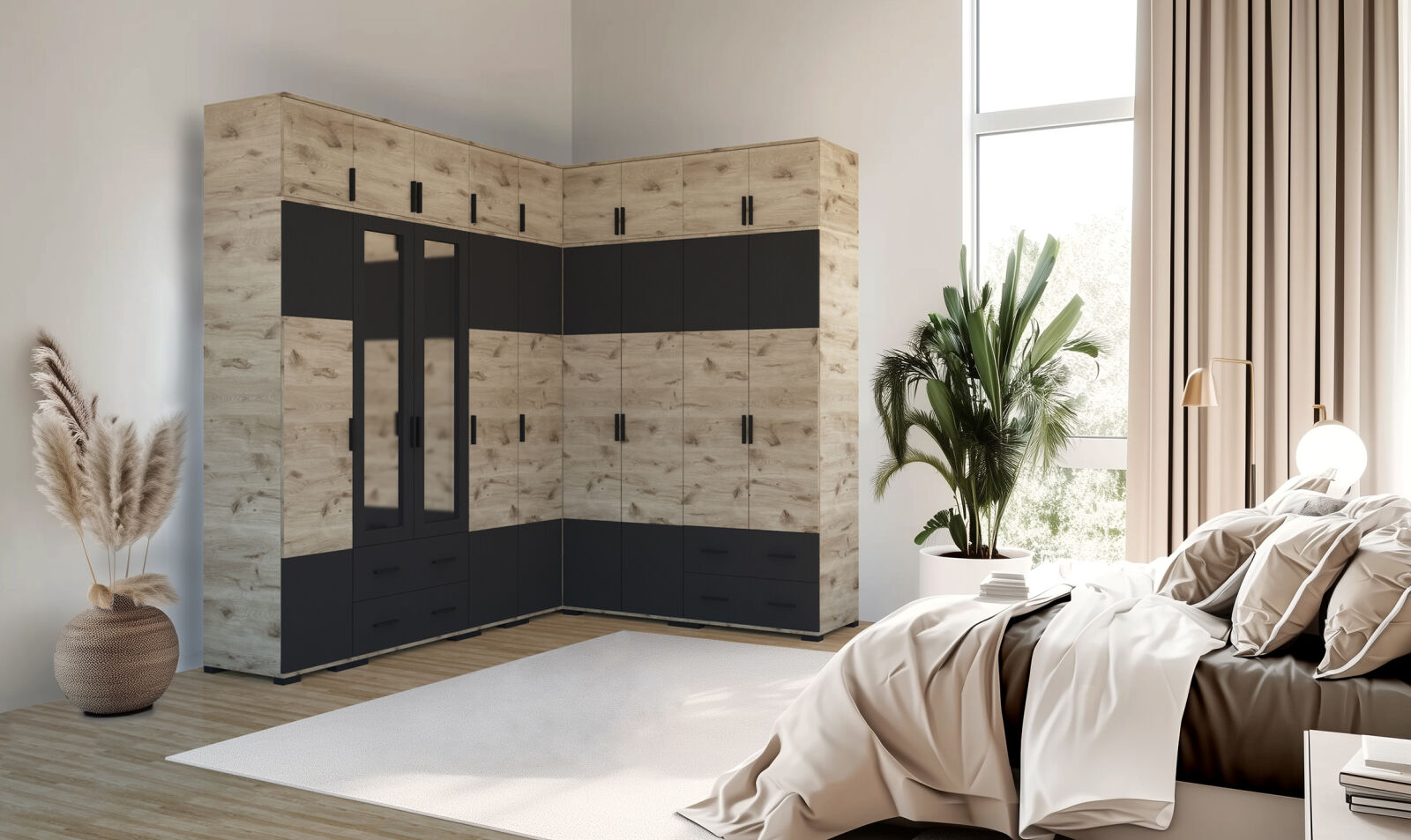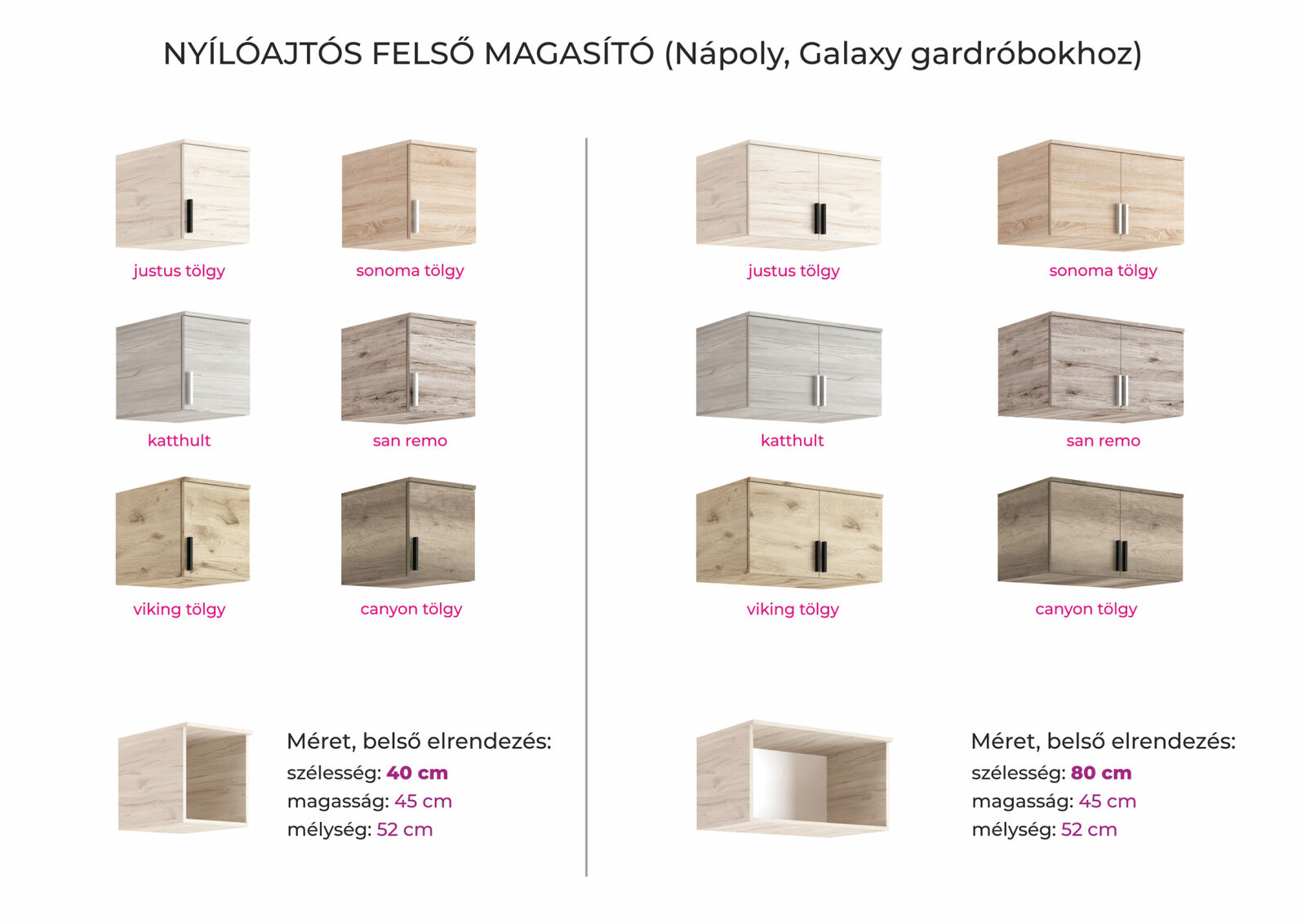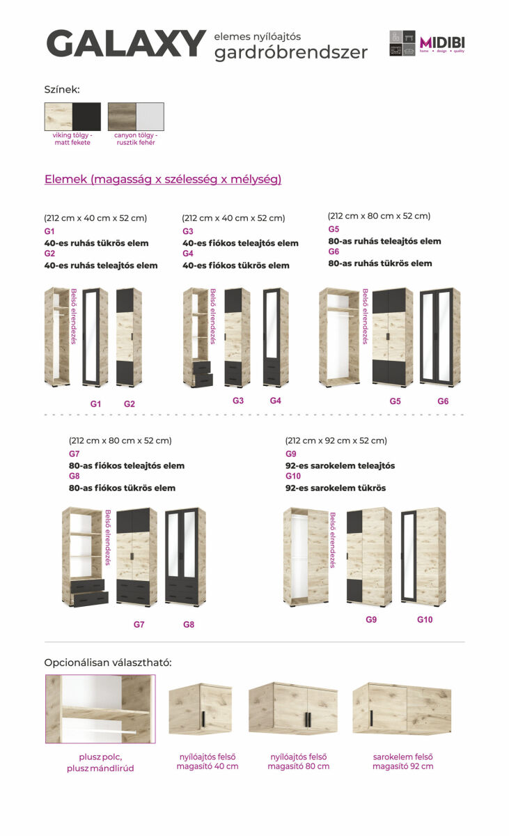 A Galaxy gardrób 40 és 80 cm-es elemei kombinálásával mindenki összeállíthatja egyéni gardróbrendszerét saját igényei szerint. Sarokeleme segítségével a rendelkezésre álló tér maximálisan kihasználható. Viking tölgy-matt fekete és canyon tölgy-rusztik fehér színkombinációban kapható. Mind a ruhás, mind a polcos-fiókos elem kérhető tükrös ajtóval is. Az elemekhez nyílóajtós felső magasító is kérhető.