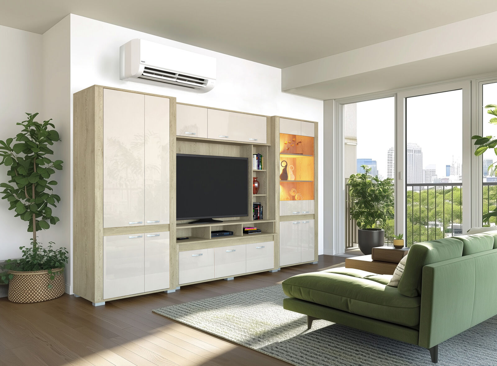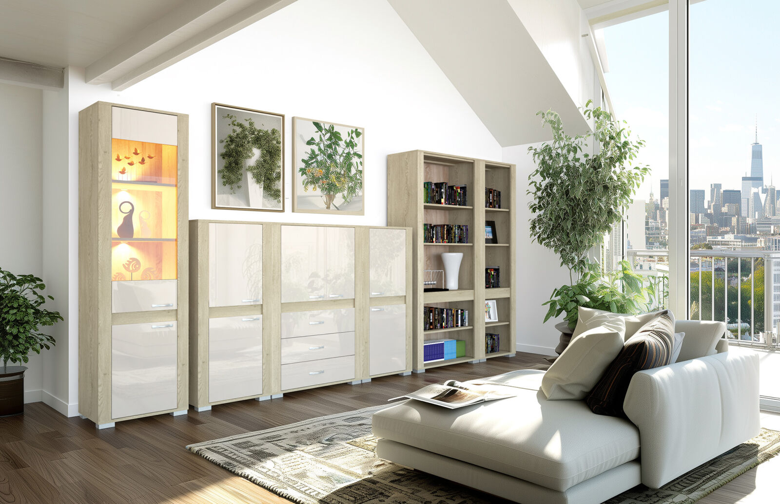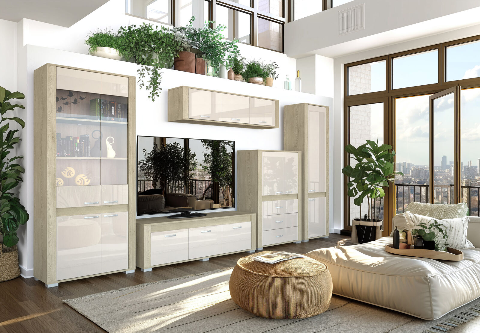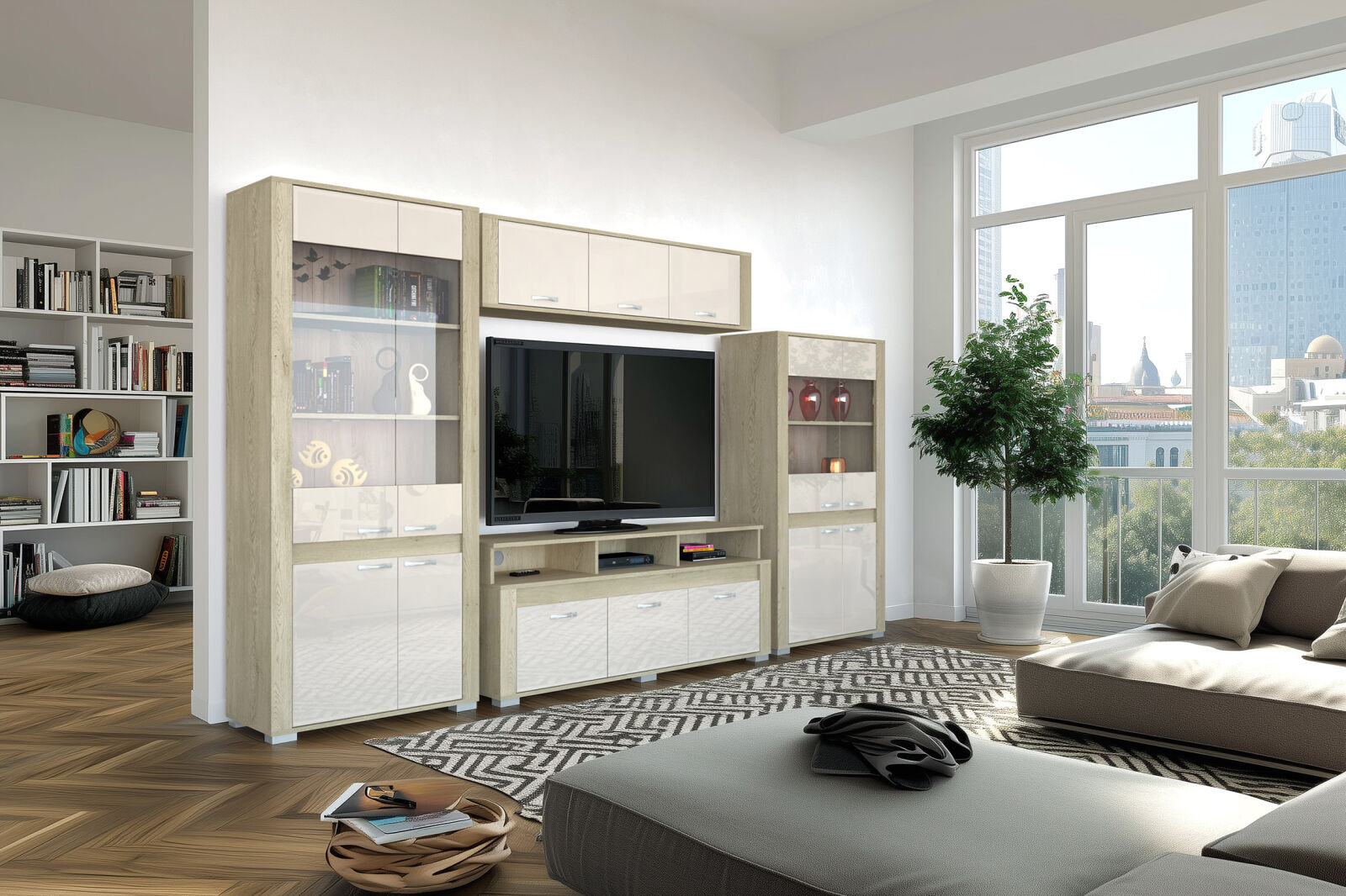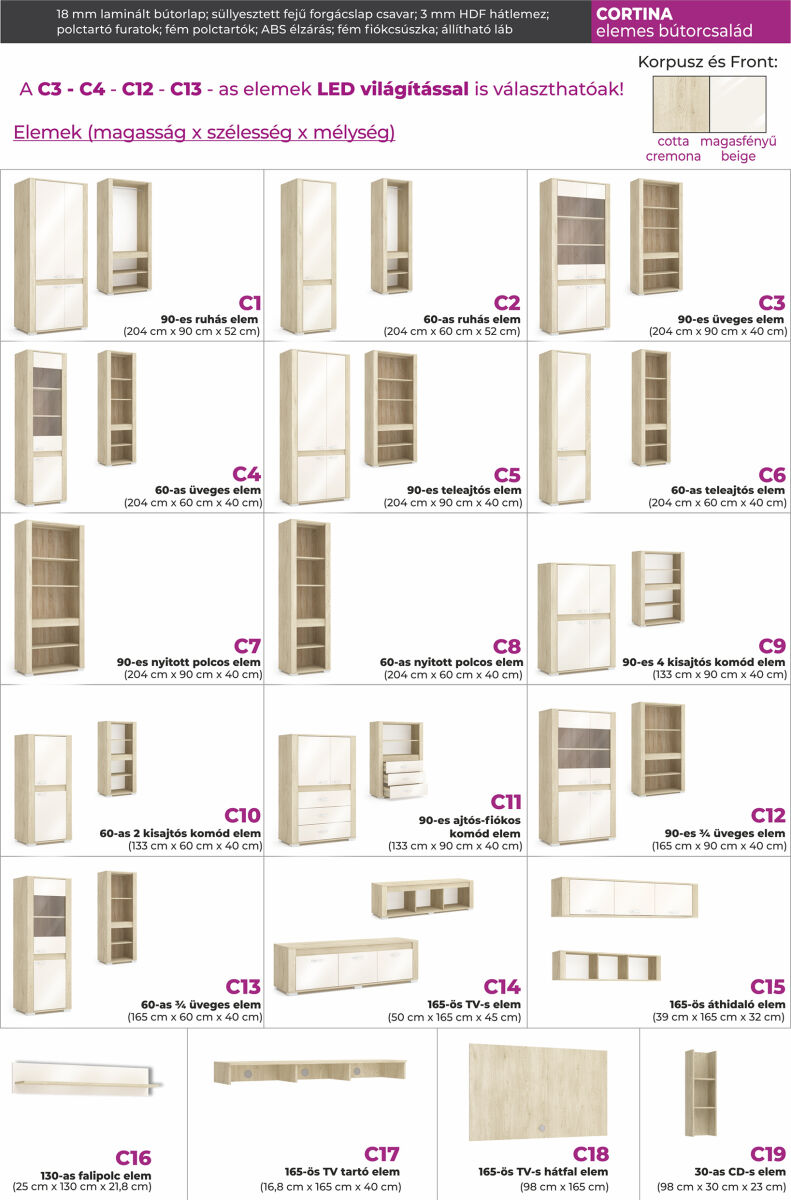 A 18 elemből álló Cortina elemes bútorcsalád cotta cremona színű korpuszához magasfényű beige front társul, így elegáns, letisztult elemekből álló összeállítás készíthető. A ruhás, polcos és komód elemekből található teleajtós és üveges kialakítású is, így teljesen a saját igényünkre szabhatjuk nappalink vagy akár hálónk berendezését. Az üveges elemekbe opcionálisan LED világítás is kérhető.