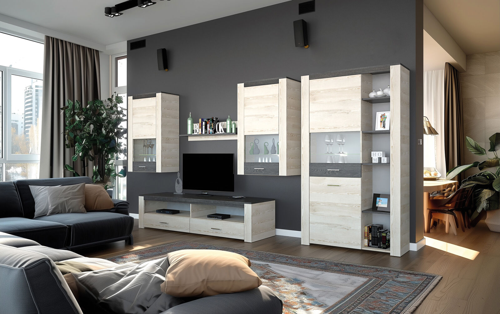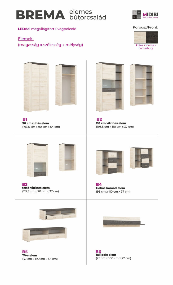 A Bréma elemes bútorcsalád variációs lehetőségeinek csak a fantázia szabhat határt. 6 különböző elemből lehet válogatni. Számos elképzelés könnyen megvalósítható, akár kisebb, akár nagyobb tér áll rendelkezésre. Krém sonoma és canterbury bútorlapos színkombinációjával, LED világításával kellemes meleg megjelenést ad a lakás szinte bármely helyiségében. Az elemek több funkcióval is felruházhatók, így akár az egész lakás egységes stílusba öltöztethető, teljes harmóniát alkotva.