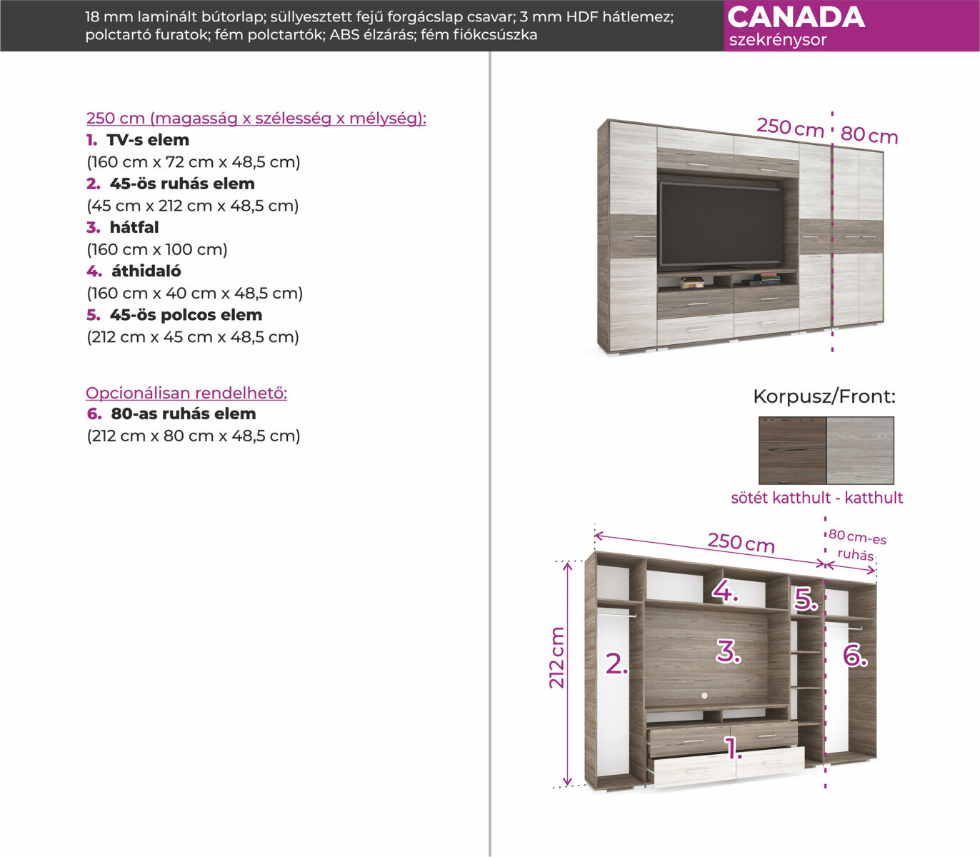 A Canada szekrénysor 250 cm-es változatban kapható. A kis tereket is otthonossá varázsolja. Opcionálisan rendelhető 80 cm-es ruhás elem.