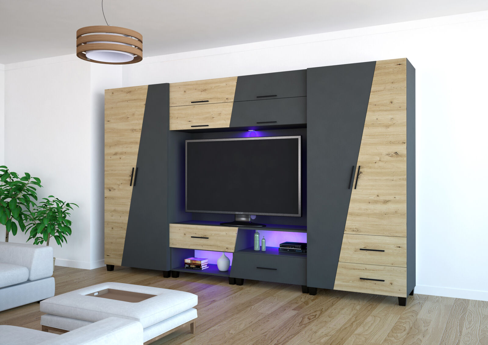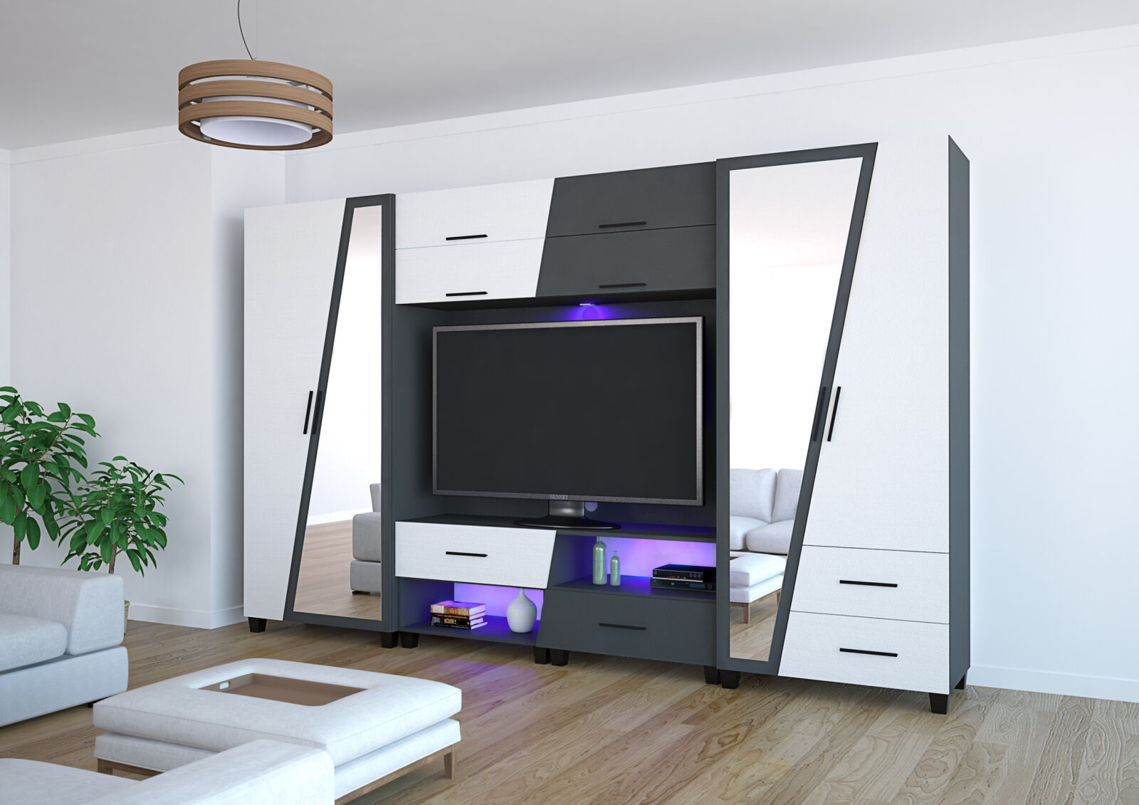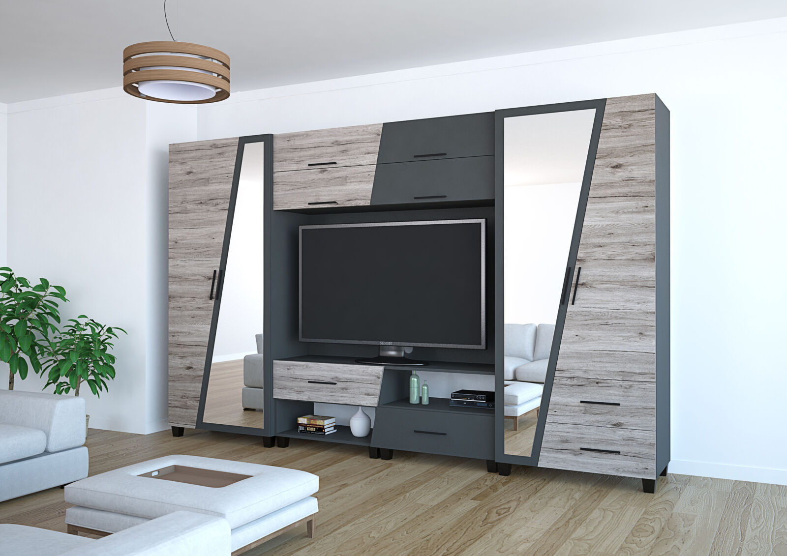 Az Onix szekrénysor 340 cm-es méretben kapható. Jól kihasználható részekből épül fel. Nemcsak praktikus, de kifejezetten mutatós az ajtók és fiókelők nem mindennapi alakja. A matt sötétszürke szín remekül harmonizál az artisan tölgy, san remo és rusztik fehér ajtókkal. A szekrénysor kérhető tükrös változatban is, illetve opcionálisan LED világítással is kiegészíthető.