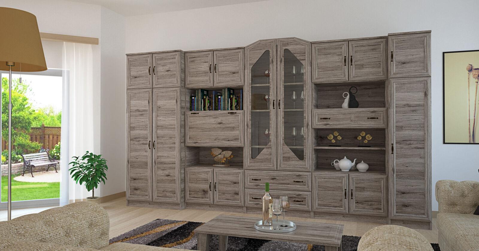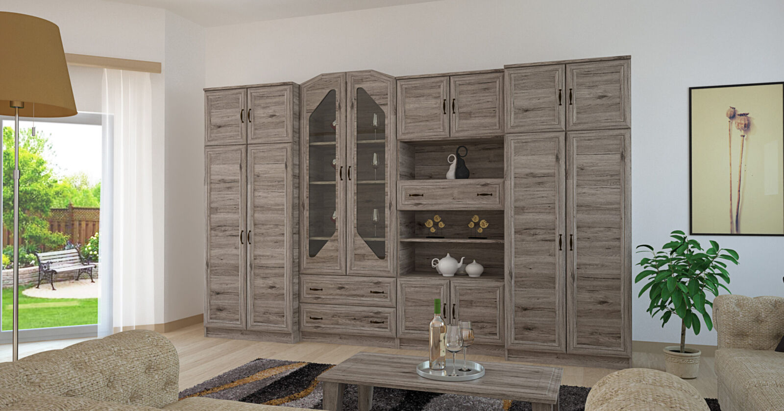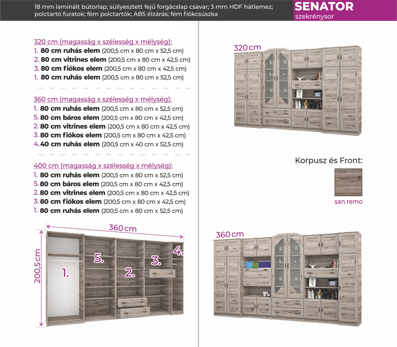 A Senator szekrénysor keretes frontjával és rombusz alakú vitrines üveg ajtajával elegáns dísze lehet otthonának. Igazi klasszikus vonalú nappali szekrénysor, mely 3 méretben, san remo színben kapható. A szekrénysor elemeinek kialakításakor a fő szempont a praktikusság volt, ezért sok tárolóhellyel rendelkezik.