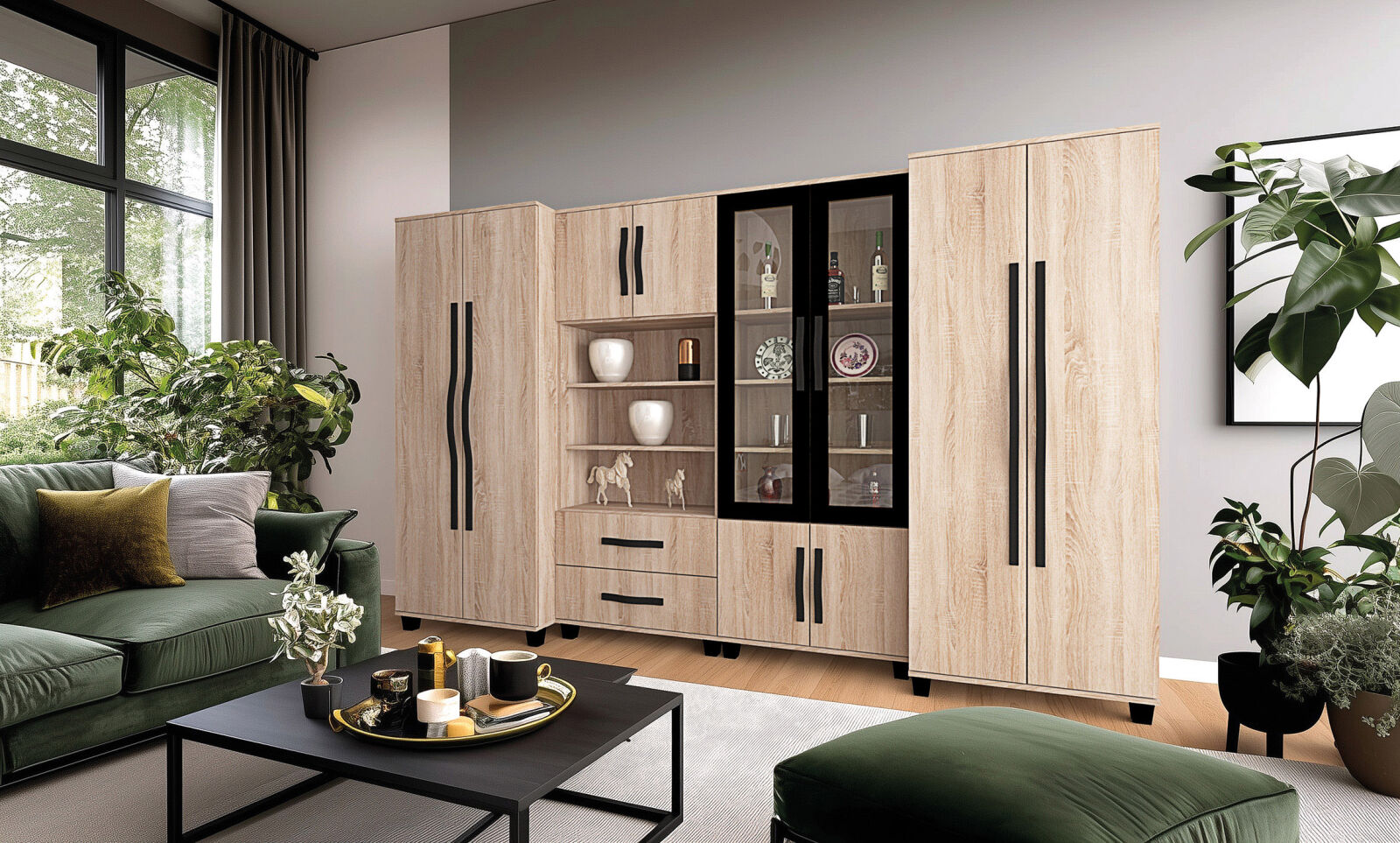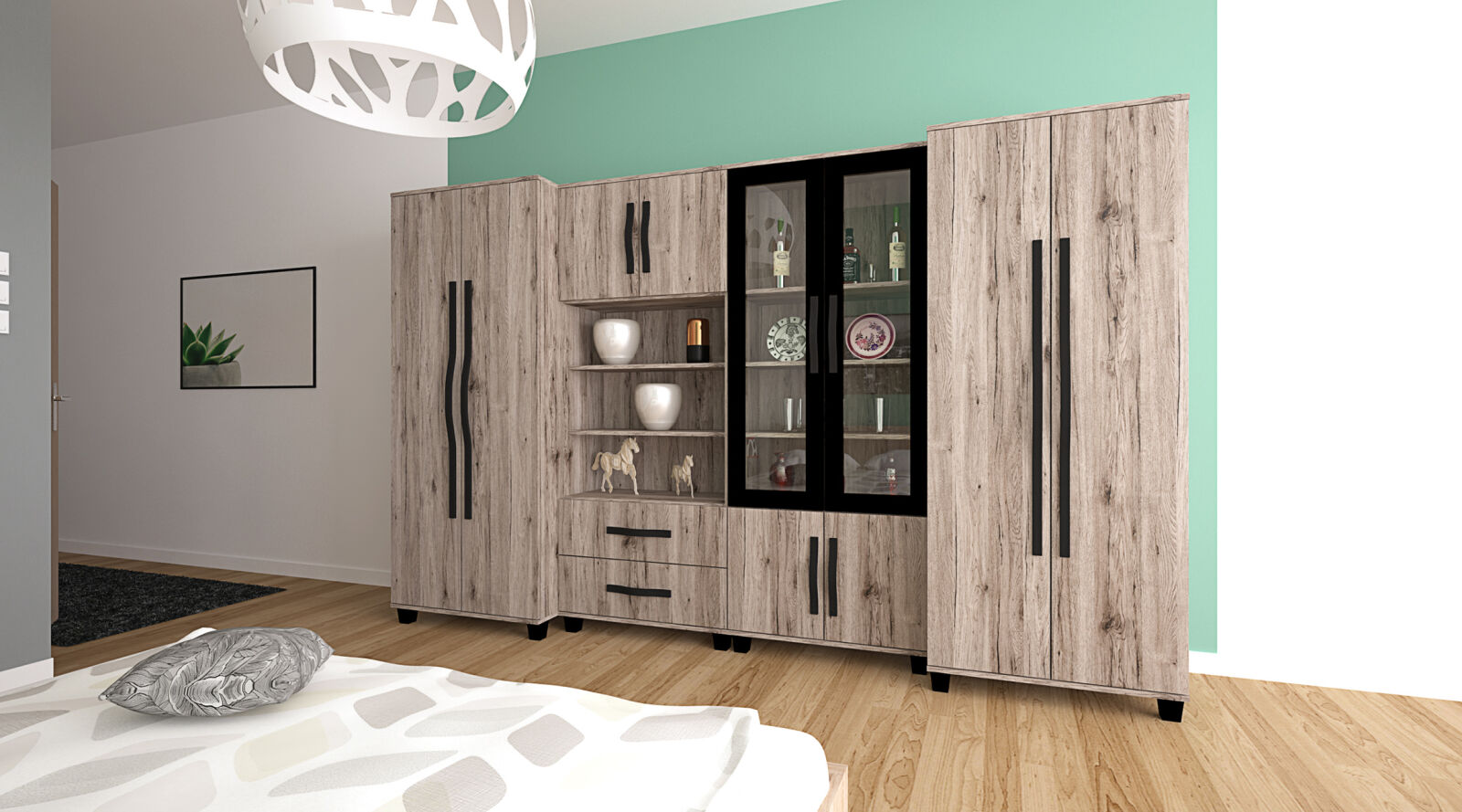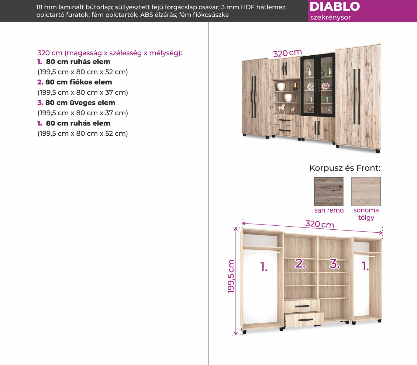 Diablo szekrénysorunk 320 centiméteres kivitelben kapható. Hagyományos formavilágát az ívelt fogója és fekete keretes vitrines eleme teszi még elegánsabbá. Sonoma tölgy, san remo színekben kapható. Jól kihasználható belső terei vannak.