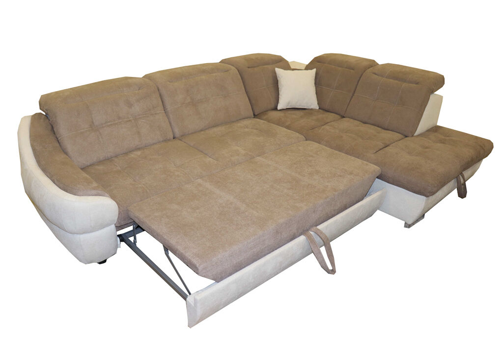Teljes szövet és bőrválasztékból rendelhető,jobbos vagy balos állású,ágyazható ,ágyneműtartós sarokgarnitúra. Hullámrugós.(+ N30as szivacs) Vasszerkezetes magas fekhelyes fekvőfelület. állítható fejtámlákkal Külmérete: 365x167x80/90cm Fekvőfelülete: 330x138cm Ülőmagasság:47cm