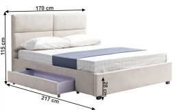 Anyag: anyag Szín: szürkebarna Méretek (SZxVxH): 170/190 x217x115 Alvási terület (SzxV): 160x200 cm Magasság rostély-ig : 28 cm Lamellás rostély-al szállítva Teherbírás oldalanként: 110 kg 1 fiók