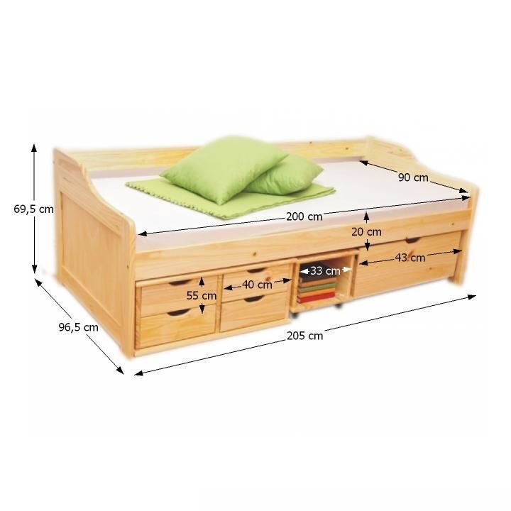 Többfunkciós ágy, 4 kis, 1 nagy fiók, 1 doboz kerekeken, lakkozott tömör fenyő, színváltozat: természetes szín, mérete:Ho/Ma/Szé: 205x69,5x96,5cm, ágy Szé/Ho 90x200 cm, az ár matrac nélkül értendő. Vásárolható hozzá matrac (90x200)