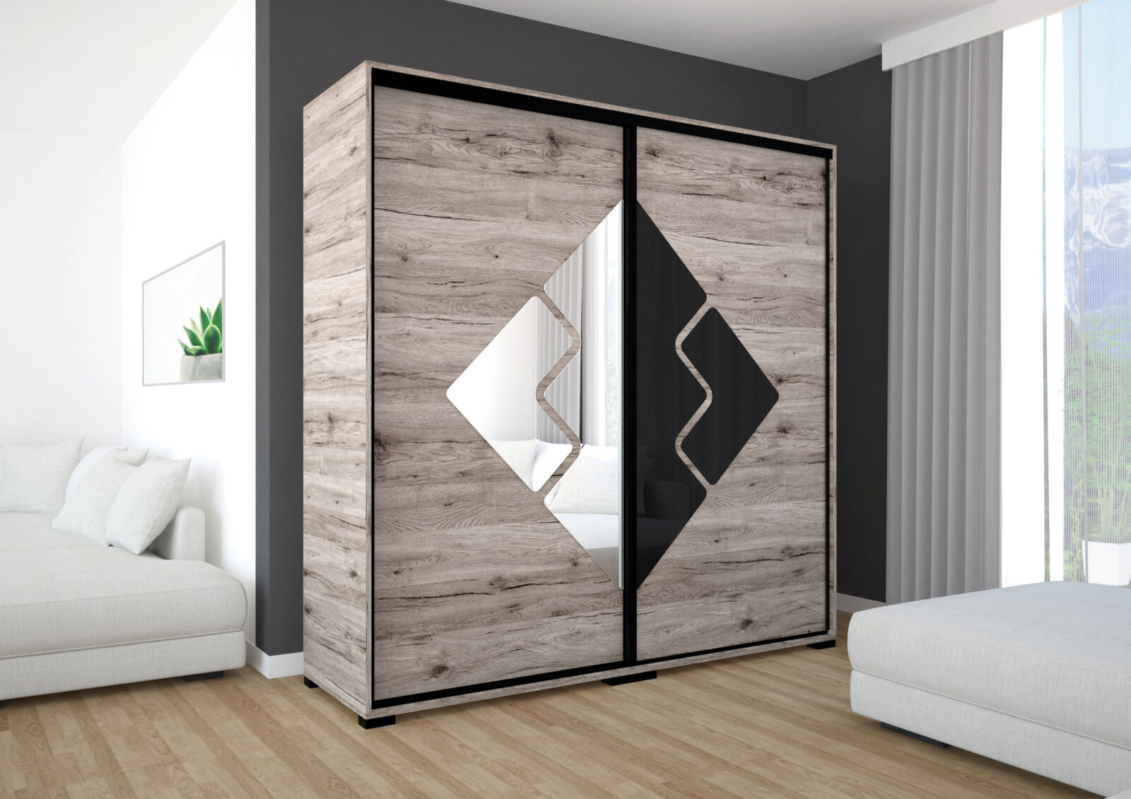 A Dover gardrób egyedi tükör dekorációval azonnal felhívja magára a figyelmet. Elegáns ívek, kellemes bútorlapszínek, ezek mind-mind jellemzik a gardróbot. 160, 180 és 200 cm-es kivitelben kapható, 16 bútorlapszín közül választhatnak kedvükre. A tolóajtónak köszönhetően a tér maximális kihasználását is lehetővé teszi. Belső elrendezése bővíthető polcokkal, fiókkonténerekkel, mándlirudakkal. Az ajtó szín külön választható. Alap variáció: egy tükör betét, illetve egy festett üveg betét, de kérhető kettő tükör betéttel, illetve kettő festett üveg betéttel is.