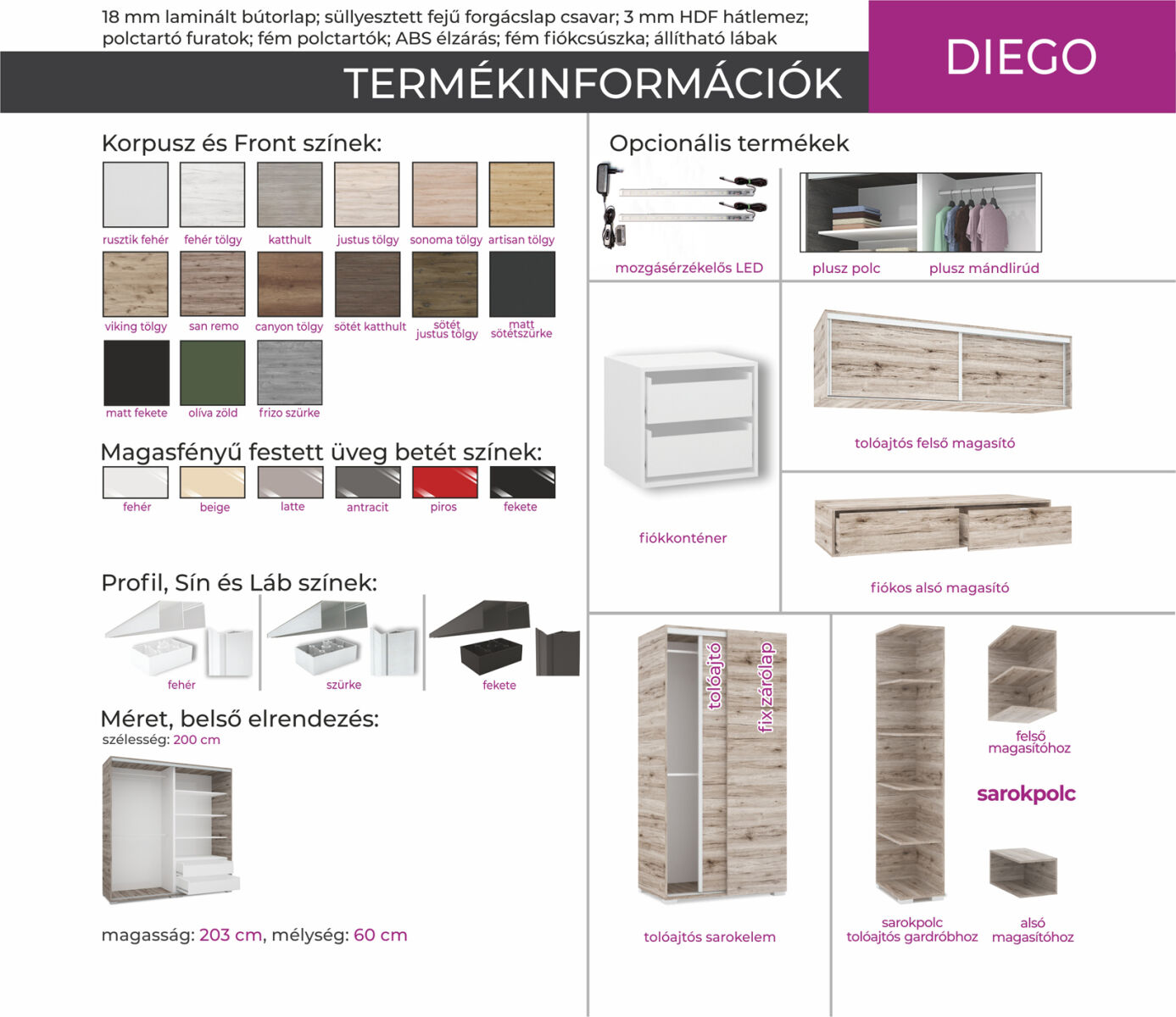 Diego gardrób 200 cm-es szélességgel kapható. 15 bútorlap és 6 festett betét szín közül választhat. Az ívesen vágott üveg elegáns, légies megjelenést kölcsönöz a gardróbnak. Az ajtókon lévő tükör formája is finoman követi az üveg alakját, így alakítva ki egy harmónikus megjelenést. Opcionálisan választható termékek: – sarokpolc – tolóajtós sarokelem – fiókos alsó magasító – tolóajtós felső magasító.