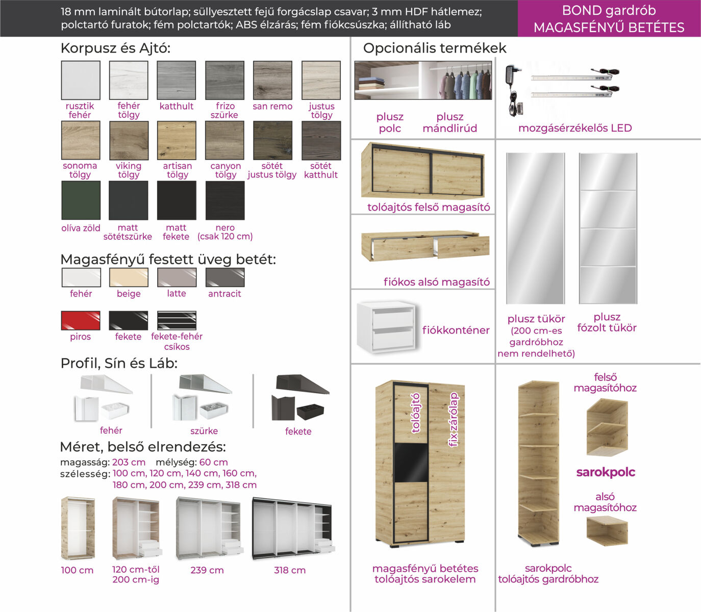 A Bond gardrób széles választékkal igyekszik mindenki igényeinek megfelelni. Számos méret és megannyi bútorlapszín közül választhat. Belső elrendezését tekintve teljesen személyre szabható, köszönhetően az akár egymásra is helyezhető fiókdobozoknak, polcoknak, mándlirudaknak. Opcionálisan választható termékek: – sarokpolc – tolóajtós sarokelem – fózolt tükör – tükör – fiókos alsó magasító – tolóajtós felső magasító.