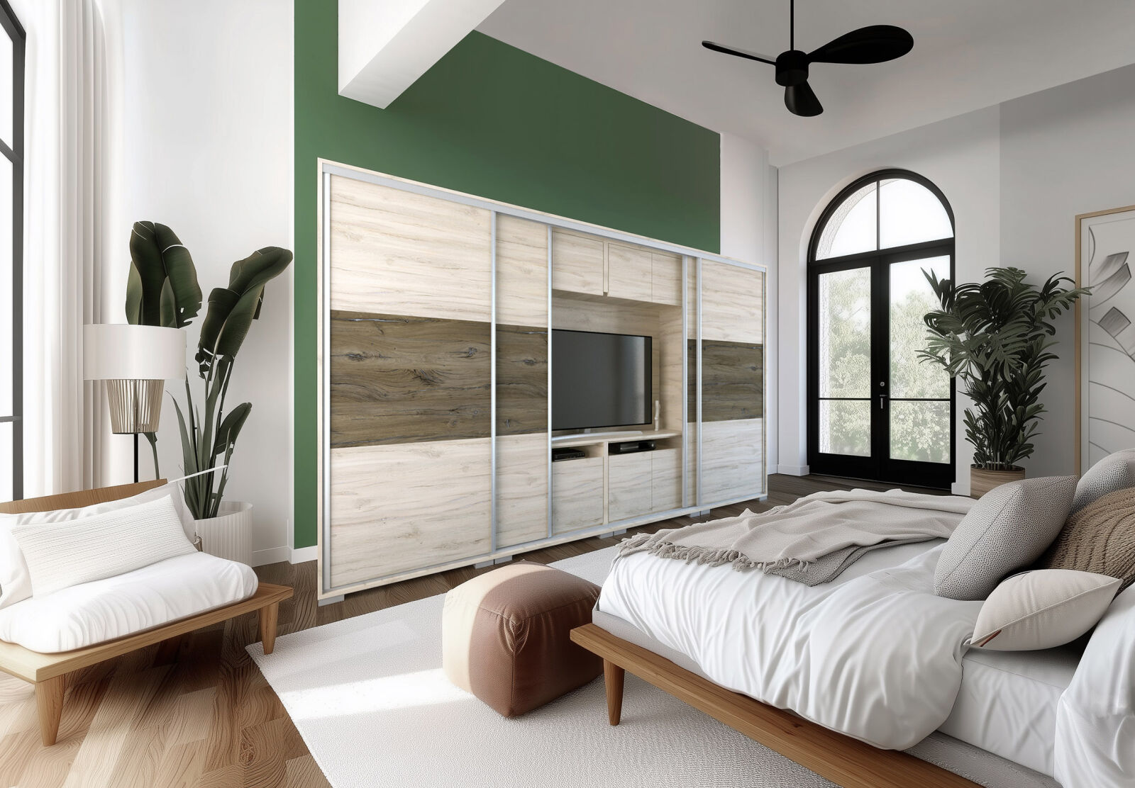 Saját igényére szabhatja a gardrób megjelenését, mivel különböző ajtó típusokkal rendelheti meg. 239 cm és 318 cm-es méretben kaphatóak. Választhatja akár díszcsíkkal ellátott ajtóval, akár tükör vagy üveg dekorációs elemmel, esetleg magasfényű ajtóval is. 14 szín közül lehet választani a korpusz és a front esetében is . Egyediségét az adja, hogy zárt állapotban egy elegáns tolóajtós gardróbnak tűnik, viszont a középső részen televízió számára kialakított hely található. Kiegészíthető még RGB Led világítással. Opcionálisan választható termékek: – sarokpolc – tolóajtós sarokelem – fózolt tükör – tükör – fiókos alsó magasító – tolóajtós felső magasító.