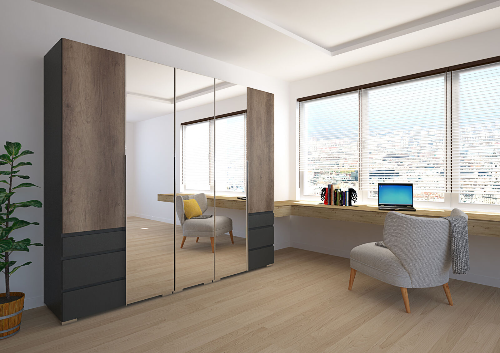 A matt sötétszürke vagy justus tölgy korpuszhoz egyaránt választható canyon tölgy vagy rusztik fehér ajtó. Ezenkívül rendelhető magasfényű fronttal is: fehér vagy szürke ajtóval. Mándlirudas, fiókos elrendezésének köszönhetően nagyon jól pakolható, szükség esetén akár polcokkal is kiegészíthető.