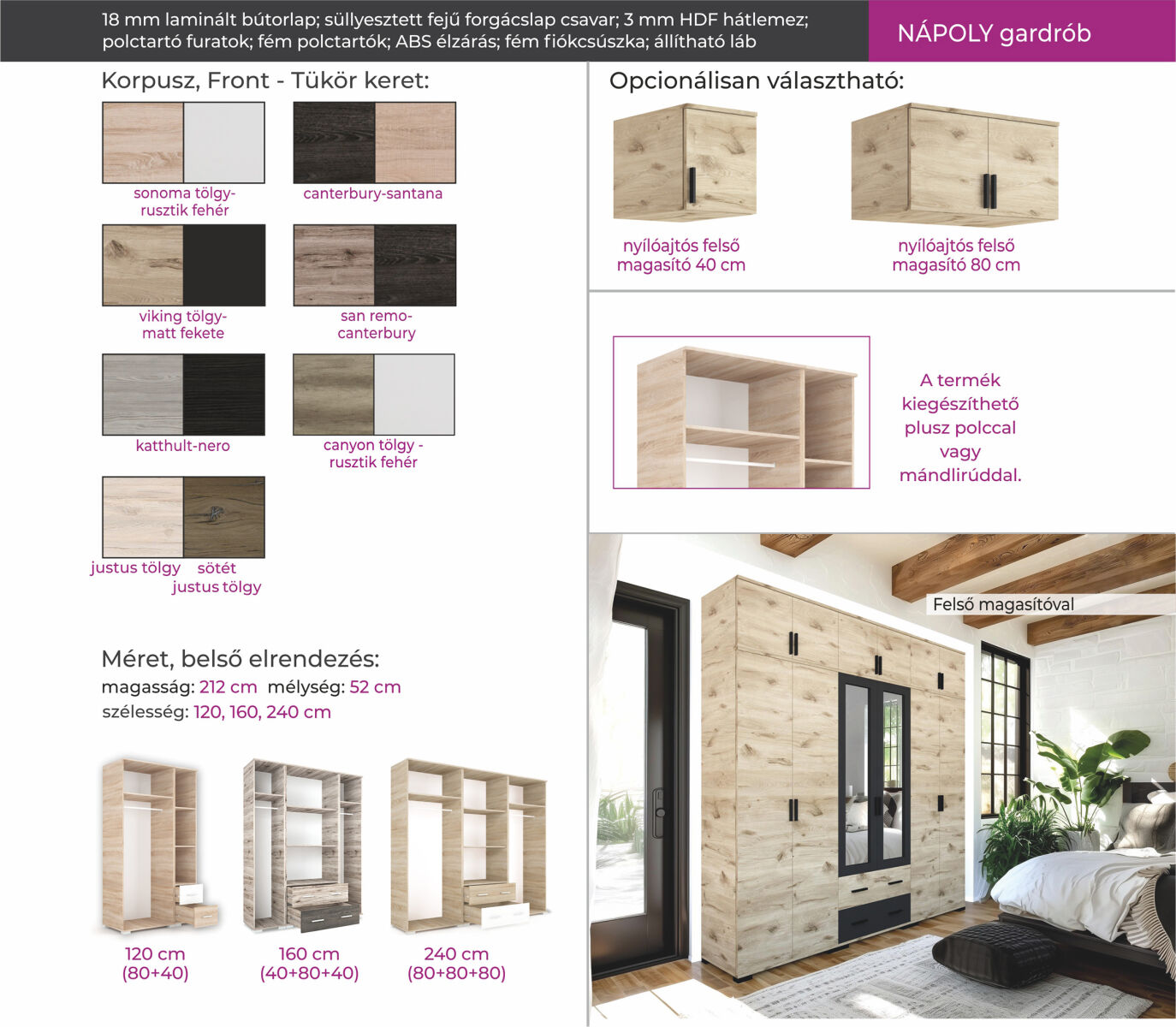 Ha a nyílóajtós gardróbokat részesíti előnyben, érdemes megtekinteni Nápoly gardróbunkat. Az ajtóval harmonizáló tükörkeret és fiókelő kellemes megjelenést kölcsönöz a gardróbnak. Legyen szó kisebb vagy nagyobb ruhatárról, a Nápoly ideális választás lehet, hiszen 120, 160 és 240 cm-es változatból lehet választani. Mindegyik méretben rendelkezik polcos-fiókos és akasztós belsővel, ami a tökéletes pakolhatóságot biztosítja. Opcionálisan nyílóajtós felső magasító is rendelhető hozzá a gardrób színeiben.