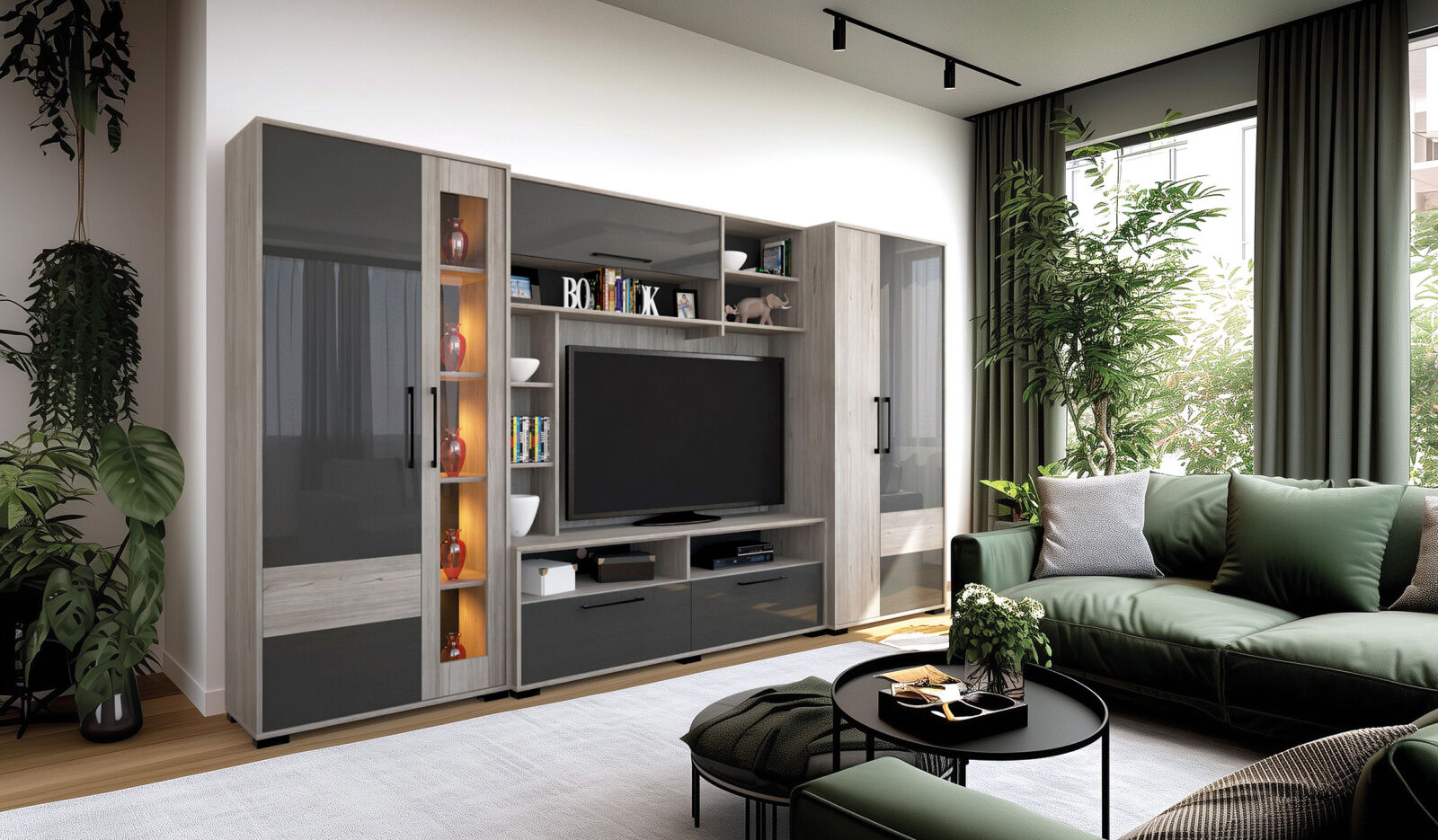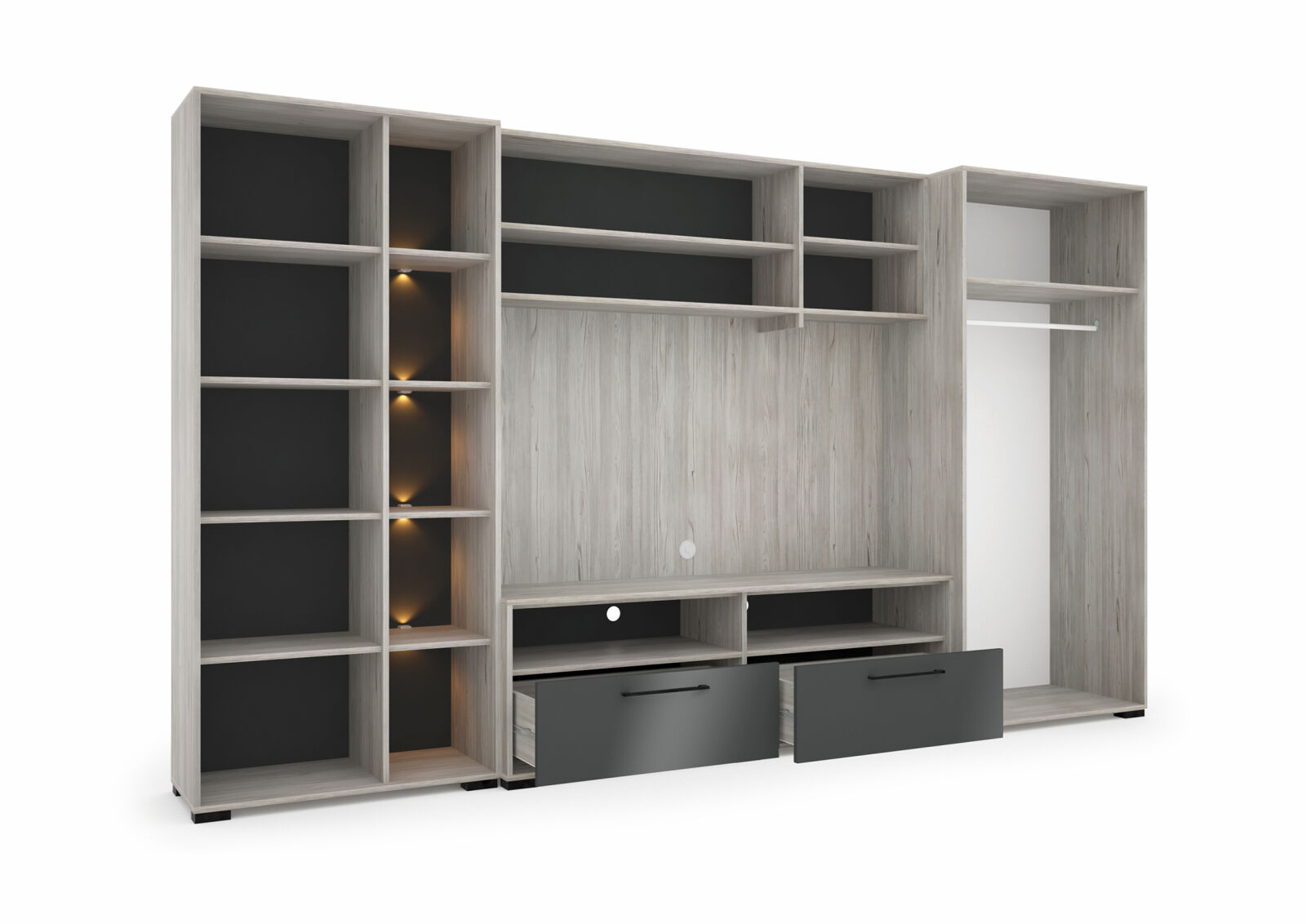 Modern forma és színvilág. Nova szekrénysorunk katthult-magasfényű antracit, illetve katthult-magasfényű fehér színkombinációban kapható. Üveges elemébe opcionálisan LED világítás is rendelhető. Polcos és akasztós elemei további polcokkal egészíthetőek ki.