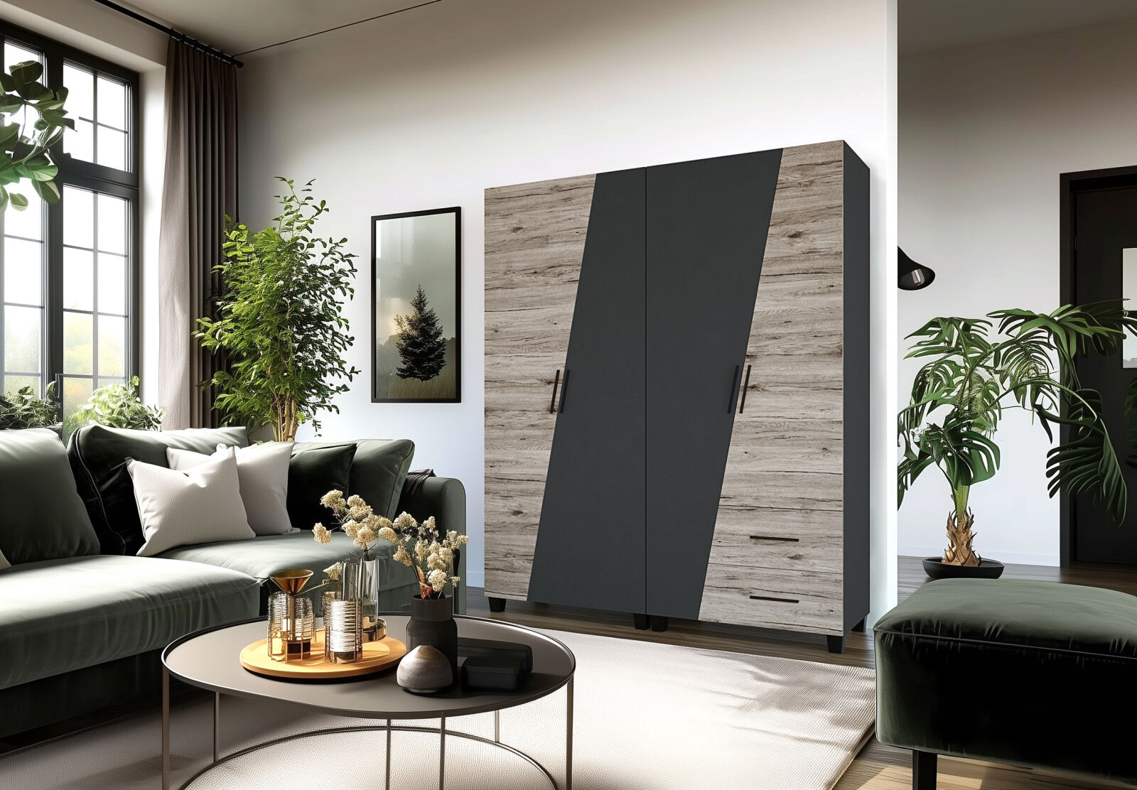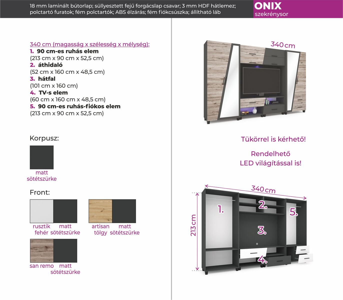 Az Onix szekrénysor 340 cm-es méretben kapható. Jól kihasználható részekből épül fel. Nemcsak praktikus, de kifejezetten mutatós az ajtók és fiókelők nem mindennapi alakja. A matt sötétszürke szín remekül harmonizál az artisan tölgy, san remo és rusztik fehér ajtókkal. A szekrénysor kérhető tükrös változatban is, illetve opcionálisan LED világítással is kiegészíthető.