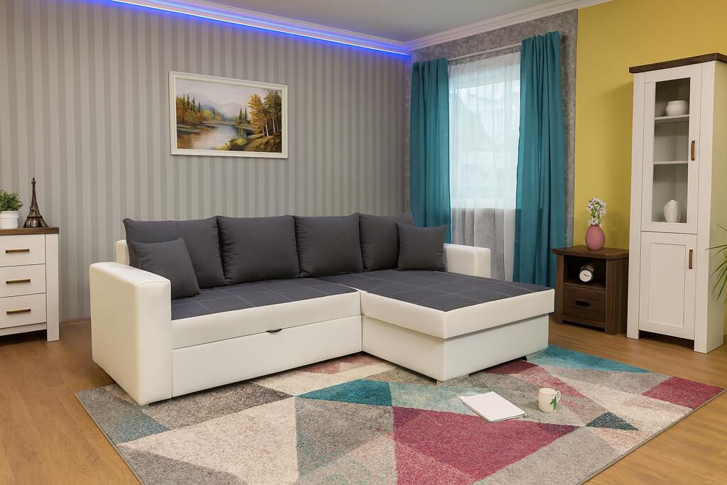 Ágyazható, ágyneműtartós, hullámrugós! 266x166x95cm. fekvőfelület: 230x140cm. Széles szövetválasztékból rendelhető, az ár, a választott szövetkategóriától függ.